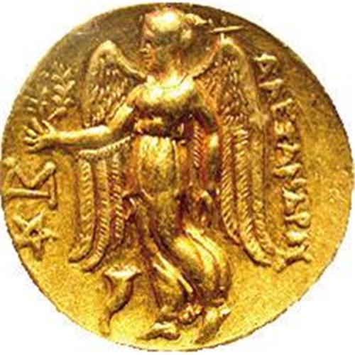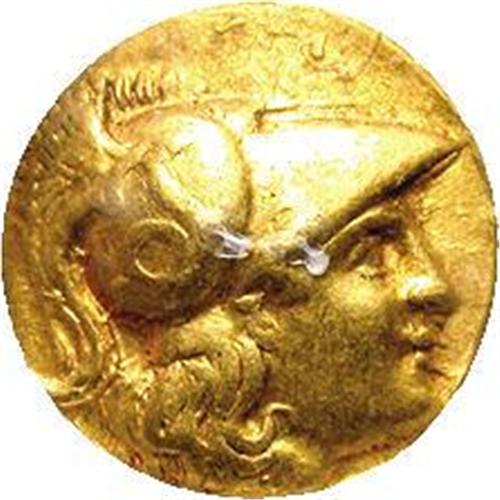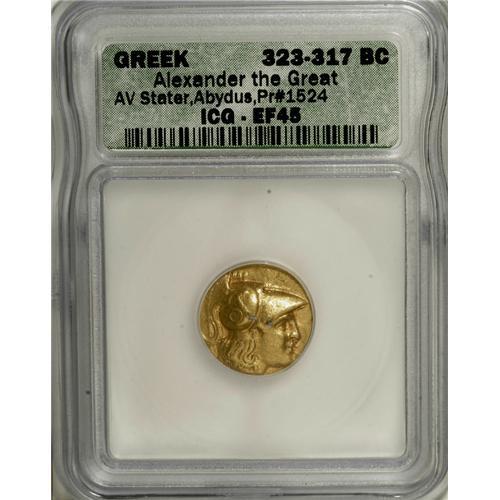 <B>Macedonian Kingdom. Alexander III.</B></I> 336-323 B.C. AV stater (17 mm). Abydos, 323-317 B.C. Helmeted head of Athena right; coiled serpent on bowl of helmet / Nike standing left, holding wreath and stylis; monogram, pentagram and cornucopiae in left field. Price 1524; Muller 381. XF 45 ICG. <BR><BR><b>Shipping:</b> Coins & Currency (<a target="_blank" href="http://www.heritageauctions.com/common/shipping.php">view shipping information</a>)