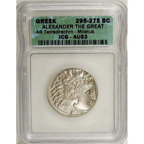 <B>Macedonian Kingdom. Alexander III.</B></I> 336-323 B.C. AR tetradrachm (27 mm). Miletos, ca. 295-275 B.C. Head of Herakles right, wearing lion's skin headdress / Zeus seated left, holding eagle and sceptre; monogram in circle in left field, double-axe below throne. Price 2147. AU53 ICG. <BR><BR><b>Shipping:</b> Coins & Currency (<a target="_blank" href="http://www.heritageauctions.com/common/shipping.php">view shipping information</a>)