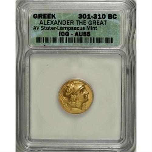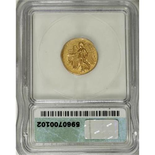 <B>Macedonian Kingdom. Alexander III, the Great.</B></I> 336-323 B.C. AV stater (18 mm, 8.32 g). Lampsakos, 310-301 B.C. Helmeted head of Athena right; bowl of helmet decorated with coiled serpent / Nike standing left, holding wreath and stylis; monogram and forepart of Pegasos in left field. Price 1388. AU55 ICG.<BR><BR><b>Shipping:</b> Coins & Currency (<a target="_blank" href="http://www.heritageauctions.com/common/shipping.php">view shipping information</a>)