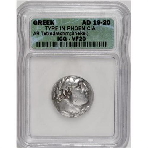 <B>Phoenicia, Tyre.</B></I> 126-65 B.C. AR shekel (23 mm, 13.17 g). Year 145 (A.D. 19/20). Laureate bust of Melkart right / Eagle standing left on prow, palm over right wing; date and club in left field, KP and monogram in right, Phoenician letter between legs. BMC -; RPC I 4658. VF20 ICG.<BR><BR><b>Shipping:</b> Coins & Currency (<a target="_blank" href="http://www.heritageauctions.com/common/shipping.php">view shipping information</a>)