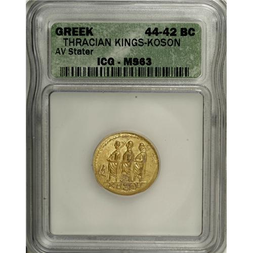 <B>Thracian Dynasts. Koson.</B></I> Ca. mid 1st century B.C. AV stater (19 mm). Roman consul walking left, accompanied by two lictors; BR monogram to left / Eagle standing left on sceptre, holding wreath. RPC 1701; BMC Thrace p. 208, 2. MS63 ICG. <BR><BR><b>Shipping:</b> Coins & Currency (<a target="_blank" href="http://www.heritageauctions.com/common/shipping.php">view shipping information</a>)