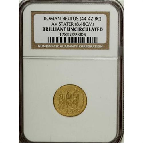<B>Thracian Dynasts. Koson.</B></I> Ca. mid 1st century B.C. AV stater (19 mm). Roman consul walking left, accompanied by two lictors; BR monogram to left / Eagle standing left on sceptre, holding wreath. RPC 1701; BMC Thrace p. 208, 2. BU NGC.<BR><BR><b>Shipping:</b> Coins & Currency (<a target="_blank" href="http://www.heritageauctions.com/common/shipping.php">view shipping information</a>)