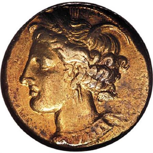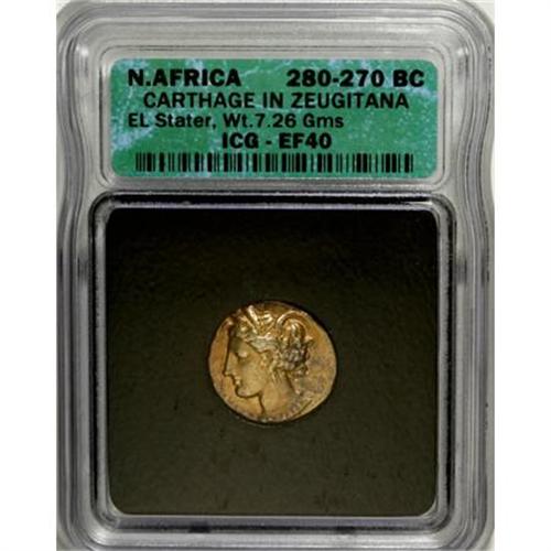 <B>Zeugitania, Carthage.</B></I> Ca. 310-290 B.C. EL stater (18 mm). Wreathed head of Tanit left / Horse standing right on single ground line. Jenkins-Lewis grp. V; MAA 12. XF40 ICG.<BR><BR><b>Shipping:</b> Coins & Currency (<a target="_blank" href="http://www.heritageauctions.com/common/shipping.php">view shipping information</a>)