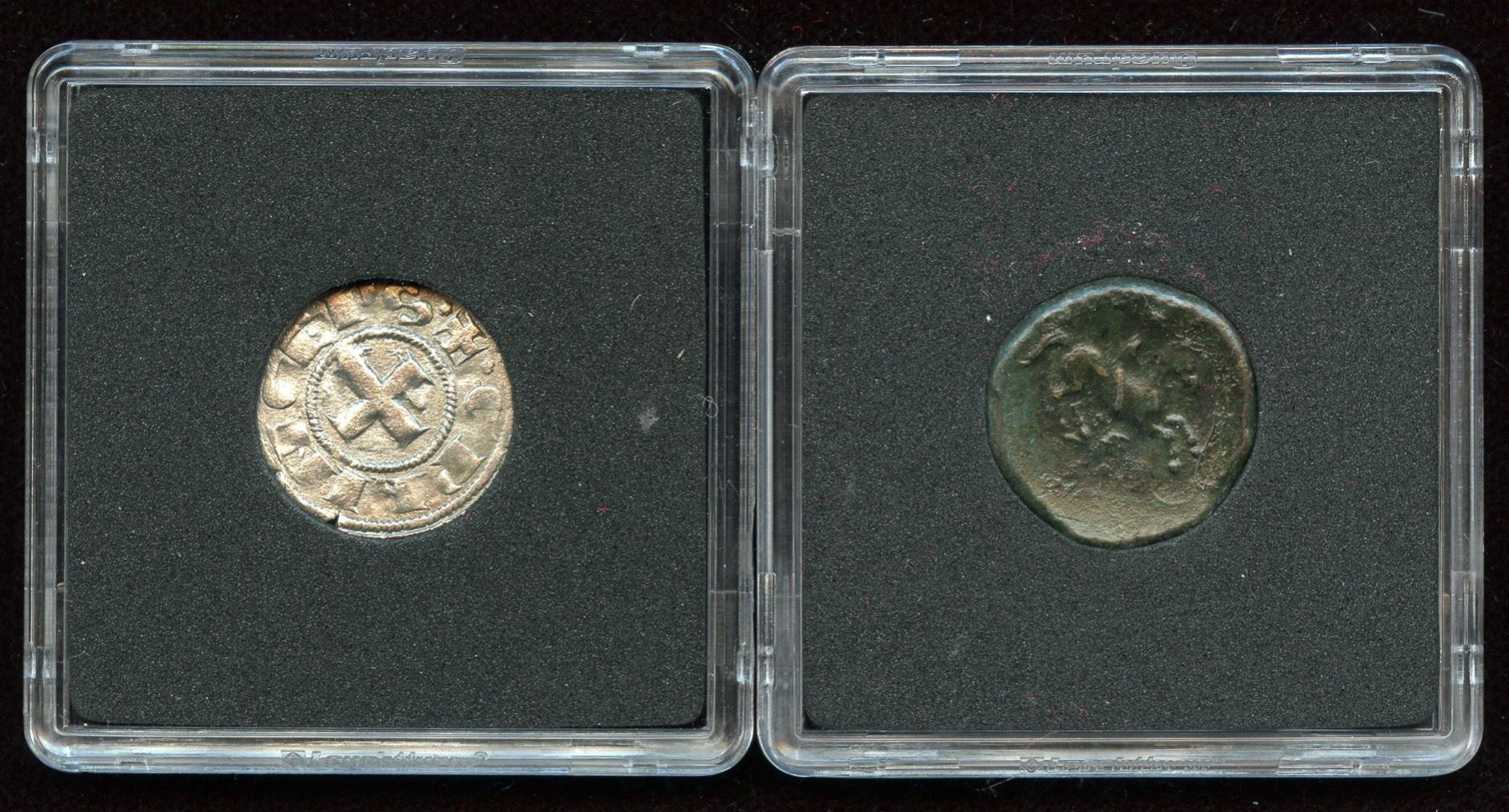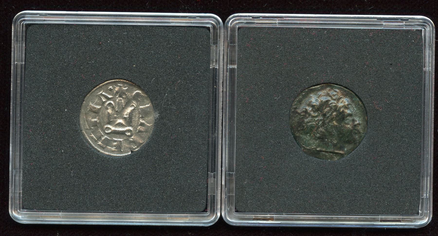 Frankish Greece Silver Denier 1287-1308 CE In black case with COA PLUS Ancient Greek Bronze Coin Philip II 359-336 BCE - in red case with COA. 2 Pcs.