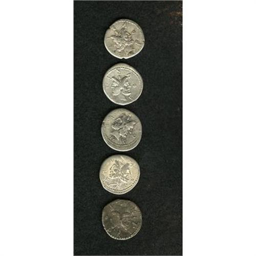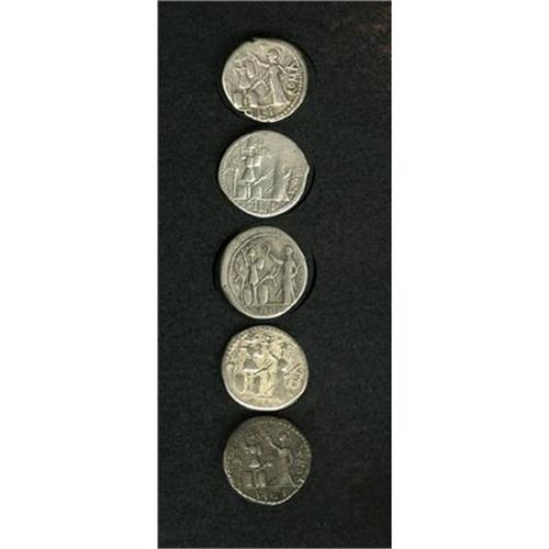 <B>Lot of five denarii of M. Furius L. f. Philus.</B></I> All coins: Janus / Roma crowning trophy. Average Fine to near VF. <BR><BR><b>Shipping:</b> Coins & Currency (<a target="_blank" href="http://www.heritageauctions.com/common/shipping.php">view shipping information</a>)