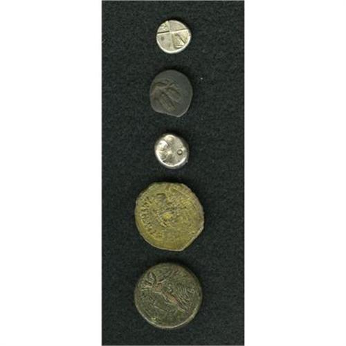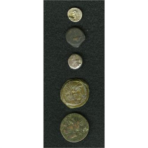 <B>Lot of five miscellaneous Greek coins.</B></I> Includes: Bruttium, The Bretti. AE 25 // Thrace, Cherronesos. AR hemidrachm // Judaea, Herodian. Herod Agrippa // Ptolemaic Kingdom. Ptolemy V. AE 26 // Persia, Achaemenid Kingdom. AR siglos. Average Fine to VF. <BR><BR><b>Shipping:</b> Coins & Currency (<a target="_blank" href="http://www.heritageauctions.com/common/shipping.php">view shipping information</a>)