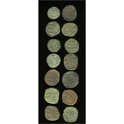 <B>Lot of fourteen Byzantine anonymous folles.</B></I> Includes various classes. All coins with bust of Christ on obverse. Average Fair to Fine, most with brown or green patina, a couple cleaned. <BR><BR><BR><b>Shipping:</b> Coins & Currency (<a target="_blank" href="http://www.heritageauctions.com/common/shipping.php">view shipping information</a>)