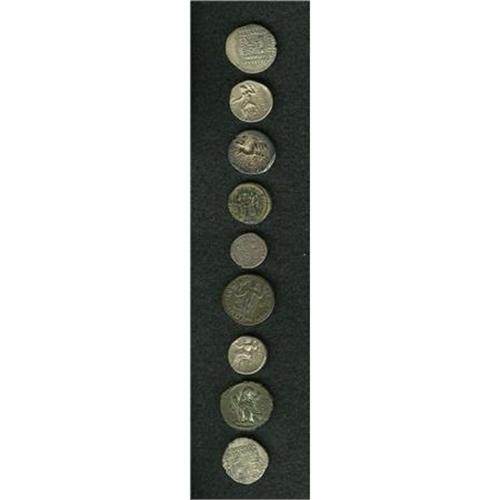 <B>Lot of nine miscellaneous ancient coins.</B></I> Includes: Macedonian Kingdom. Alexander III. Drachm (2) // Later Parthian drachms (2) // Egypt, Alexandrian. Probus. Potin tetradrachm // Roman Republican denarius // Late Roman AE (3). Average Fair to VF. <BR><BR><b>Shipping:</b> Coins & Currency (<a target="_blank" href="http://www.heritageauctions.com/common/shipping.php">view shipping information</a>)