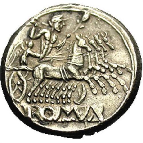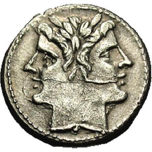 <B>Anonymous.</B></I> Ca. 225-214 B.C. AR didrachm (20 mm, 6.59 g). Uncertain Italian mint. Laureate head of Janus; pellet below / Jupiter in quadriga driven by Victory right. Cf. Crawford 31/1 (without pellet); cf. Sydenham 64c; cf. RSC 23 (without pellet). Toned VF, die-break on obverse, a little porous.<BR><BR><b>Shipping:</b> Coins & Currency (<a target="_blank" href="http://www.heritageauctions.com/common/shipping.php">view shipping information</a>)
