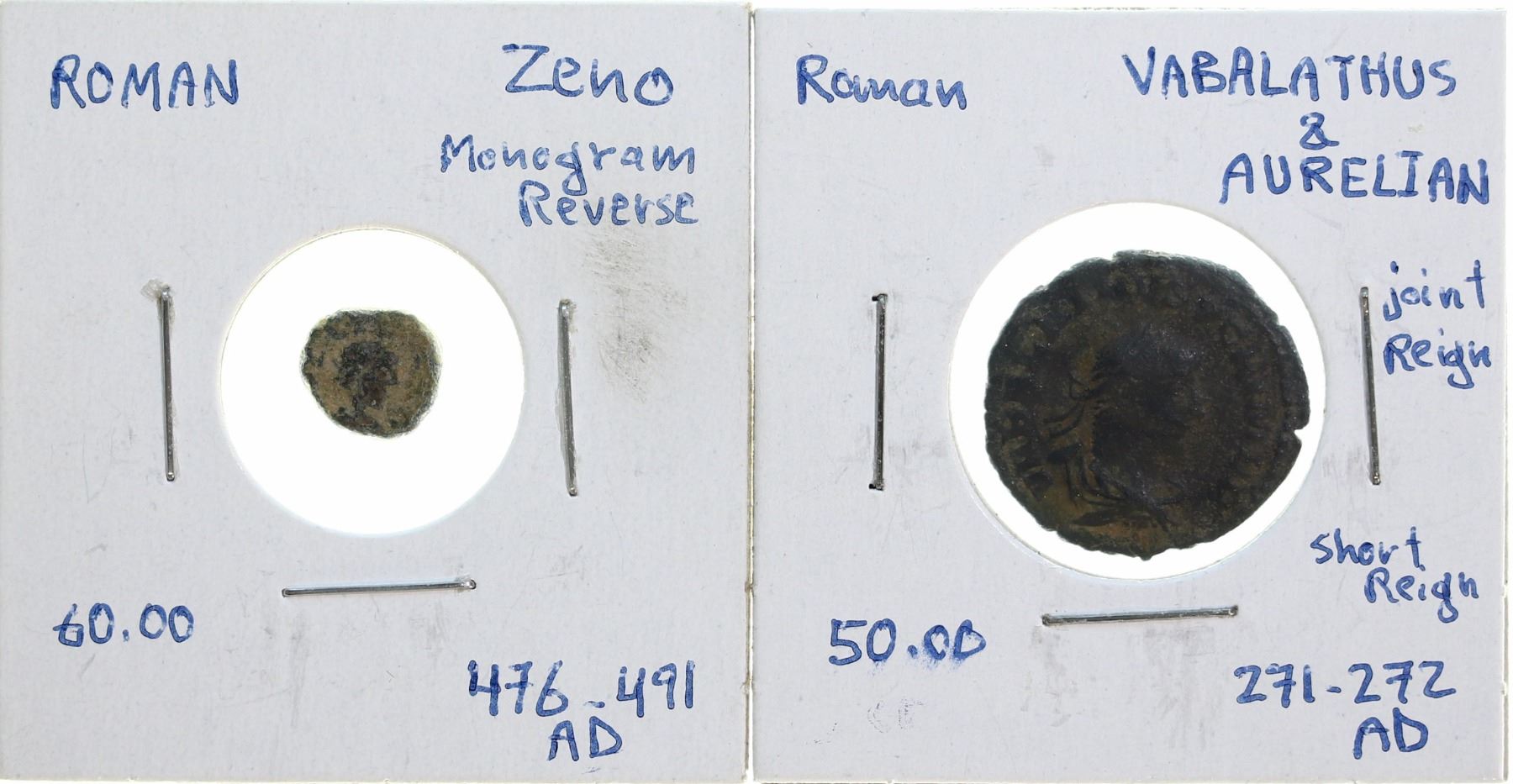 Ancients; Roman Imperial AURELIAN with VABALATHUS. 271-272 AD & Zeno 476-491 Monogram Rev. Lot of 2 issues. Æ. .