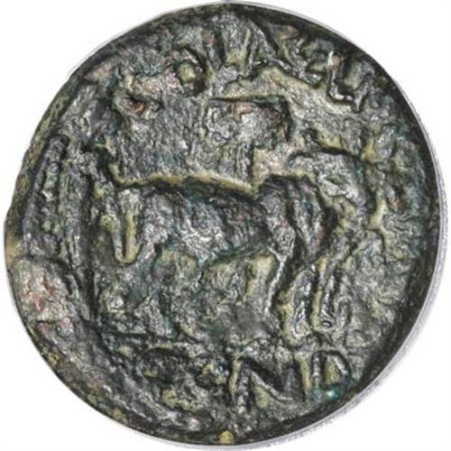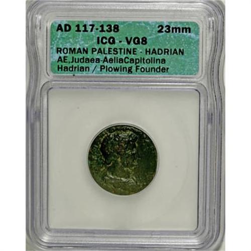 <B>Judaea, Aelia Capitolina (Jerusalem). Hadrian.</B></I> 117-138 C.E. AE (22.5 mm). 136 C.E. Laureate, draped, and cuirassed bust right / Hadrian, as priest-founder, plowing with yoked oxen right; vexillum behind. Meshorer, <I>Aelia Capitolina</B></I> 2; Hendin 810. VG8 ICG.<BR><I>From The Madison Collection.</B></I><BR><BR><b>Shipping:</b> Coins & Currency (<a target="_blank" href="http://www.heritageauctions.com/common/shipping.php">view shipping information</a>)