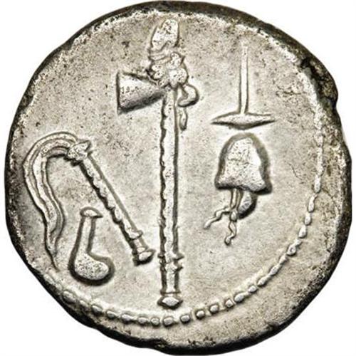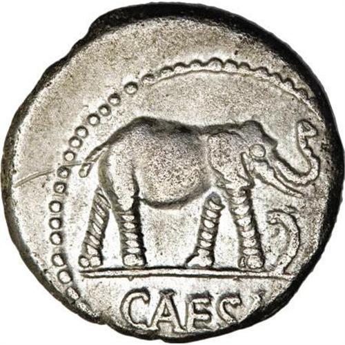 <B>Julius Caesar.</B></I> 49-48 B.C. AR denarius (18 mm, 3.76 g). Military mint traveling with Caesar. Elephant advancing right, trampling on serpent / Simpulum, aspergillum, axe, and apex. Crawford 443/1; HCRI 9; Sydenham 1006; RSC 49. VF, minor porosity, obverse struck off center.<BR><BR><b>Shipping:</b> Coins & Currency (<a target="_blank" href="http://www.heritageauctions.com/common/shipping.php">view shipping information</a>)