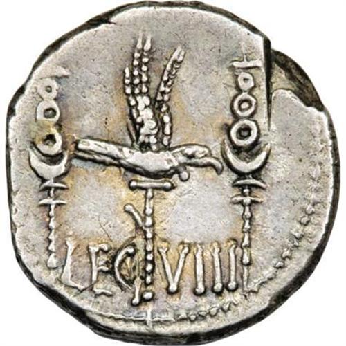 <B>Mark Antony.</B></I> 32-31 B.C. AR denarius (16 mm, 3.70 g). Uncertain mint in Greece, perhaps Patras(?). Galley sailing right / LEG VIII, aquila between two legionary standards. Crawford 544/21; HCRI 358; Sydenham 1225; RSC 35. Toned VF, edge flaw on reverse. Nice.<BR><BR><b>Shipping:</b> Coins & Currency (<a target="_blank" href="http://www.heritageauctions.com/common/shipping.php">view shipping information</a>)