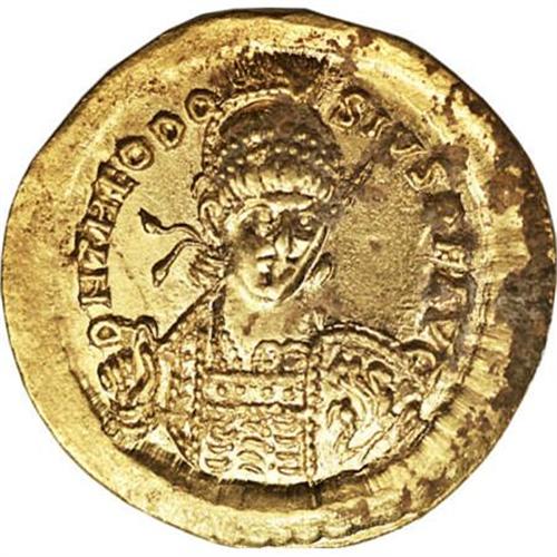 <B>Theodosius II.</B></I> A.D. 402-450. AV dolidus (21 mm, 4.42 g). Constantinople, A.D. 430-440. Helmeted and cuirassed bust facing slightly right, holding spear over shoulder and shield with horseman motif / Constantinopolis seated left, holding globus cruciger in right hand, sceptre in left, foot resting on prow; shield at her side; star in right field; B/CONOB. RIC 257; Depeyrot 81/1. XF, encrustation on obverse (can probably be removed), small puncture mark on reverse.<BR><BR><b>Shipping:</b> Coins & Currency (<a target="_blank" href="http://www.heritageauctions.com/common/shipping.php">view shipping information</a>)