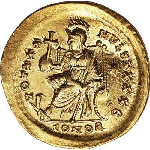 <B>Theodosius II.</B></I> A.D. 402-450. AV dolidus (21 mm, 4.42 g). Constantinople, A.D. 430-440. Helmeted and cuirassed bust facing slightly right, holding spear over shoulder and shield with horseman motif / Constantinopolis seated left, holding globus cruciger in right hand, sceptre in left, foot resting on prow; shield at her side; star in right field; B/CONOB. RIC 257; Depeyrot 81/1. XF, encrustation on obverse (can probably be removed), small puncture mark on reverse.<BR><BR><b>Shipping:</b> Coins & Currency (<a target="_blank" href="http://www.heritageauctions.com/common/shipping.php">view shipping information</a>)
