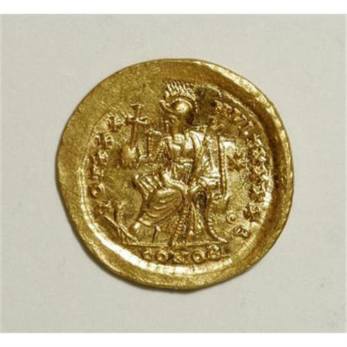 <B>Theodosius II.</B></I> A.D. 402-450. AV dolidus (21 mm, 4.42 g). Constantinople, A.D. 430-440. Helmeted and cuirassed bust facing slightly right, holding spear over shoulder and shield with horseman motif / Constantinopolis seated left, holding globus cruciger in right hand, sceptre in left, foot resting on prow; shield at her side; star in right field; B/CONOB. RIC 257; Depeyrot 81/1. XF, encrustation on obverse (can probably be removed), small puncture mark on reverse.<BR><BR><b>Shipping:</b> Coins & Currency (<a target="_blank" href="http://www.heritageauctions.com/common/shipping.php">view shipping information</a>)