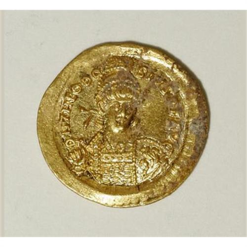 <B>Theodosius II.</B></I> A.D. 402-450. AV dolidus (21 mm, 4.42 g). Constantinople, A.D. 430-440. Helmeted and cuirassed bust facing slightly right, holding spear over shoulder and shield with horseman motif / Constantinopolis seated left, holding globus cruciger in right hand, sceptre in left, foot resting on prow; shield at her side; star in right field; B/CONOB. RIC 257; Depeyrot 81/1. XF, encrustation on obverse (can probably be removed), small puncture mark on reverse.<BR><BR><b>Shipping:</b> Coins & Currency (<a target="_blank" href="http://www.heritageauctions.com/common/shipping.php">view shipping information</a>)