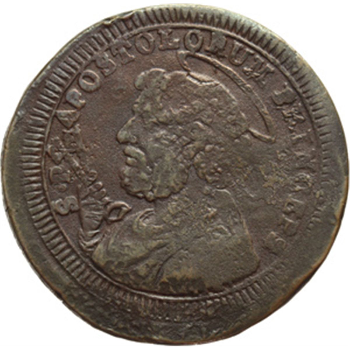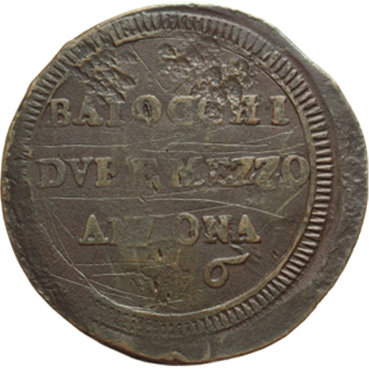Monete e Medaglie di Zecche Italiane. Ancona. Pio VI (1775-1799). Sampietrino 1796. M.145. AE. g. 16.05 RR. Ribattuta su tondello di altra moneta, al modulo della madonnina. Difetti da conio, altrimenti bel BB.
