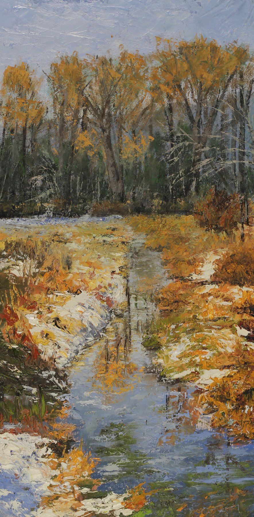 I use only a palette knife to paint my works. I feel the texture mimics the outdoors. This, plus the light at that moment, present my impression of the time and place.