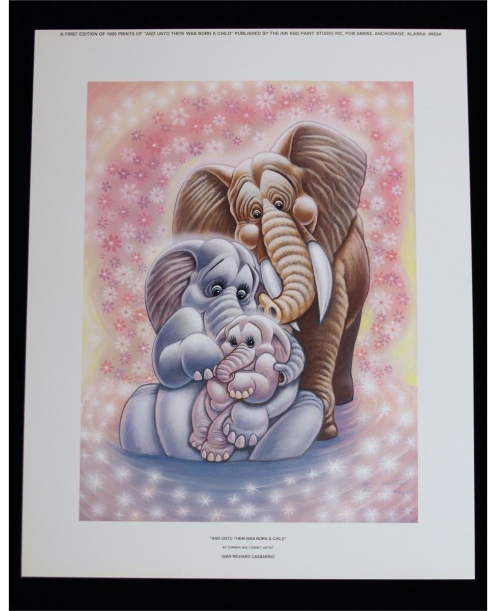 And Unto Them Was Born A Child by G.R. Cassarino AP731. "And Unto Them Was Born a Child" by G.R. Cassarino Walt Disney Artist. You haven't seen "Wildlife" until you've seen Cassarino. Former Walt Disney Artist G.R. Cassarino utilizes the style and techniques of the animated film to present the lifestyles and animals with an individual personality in this print "And Unto Them Was Born a Child". A first edition of 1000 prints published by the Ink & Paint Studio. Dimensions: 20" X 16".