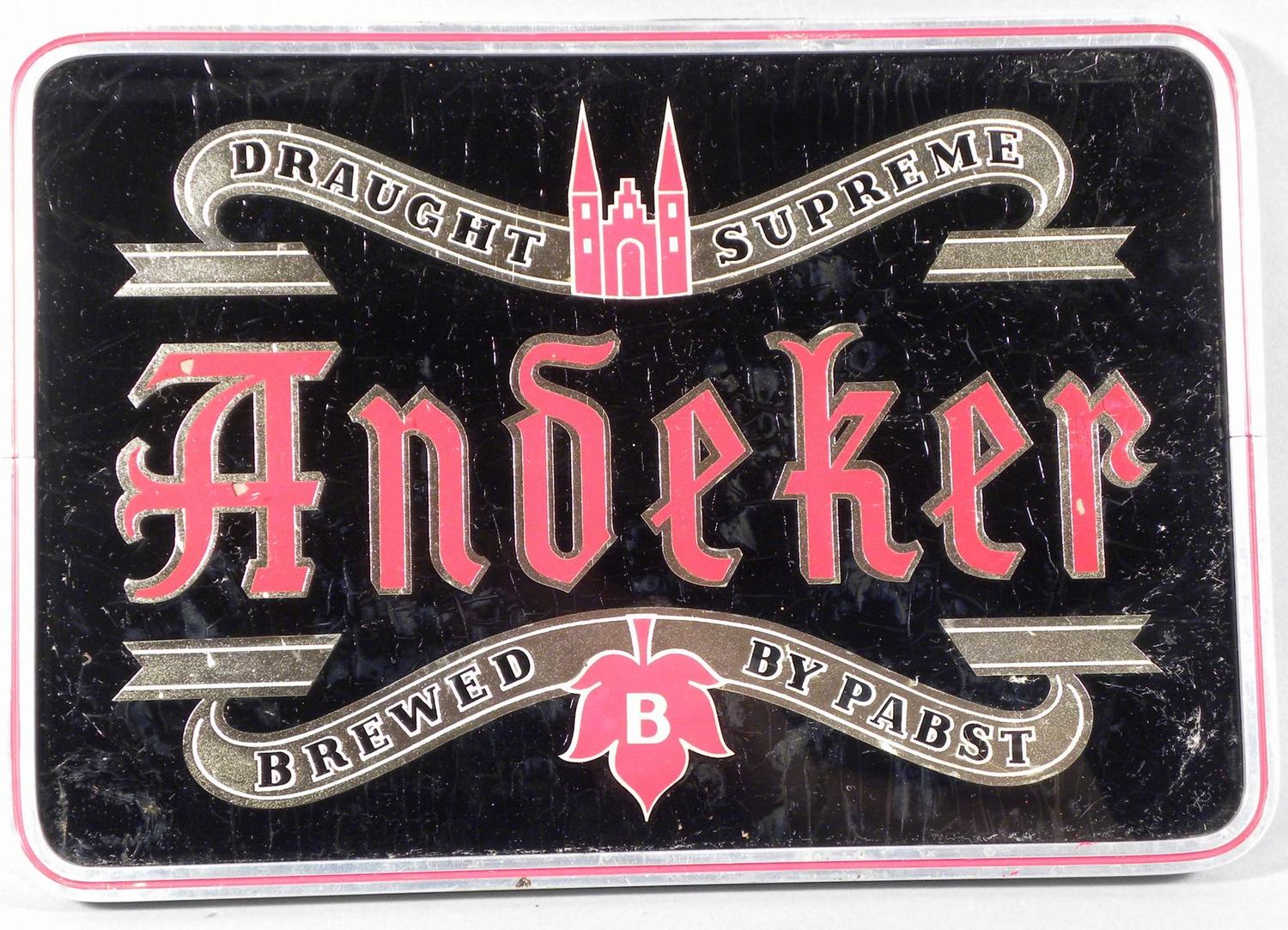 Andeker Draft Supreme Reverse Glass Beer Sign. Brewed by Pabst. Aluminum frame, easel back. Some normal crazing otherwise good condition. 14 1/4 X 10 inches.
