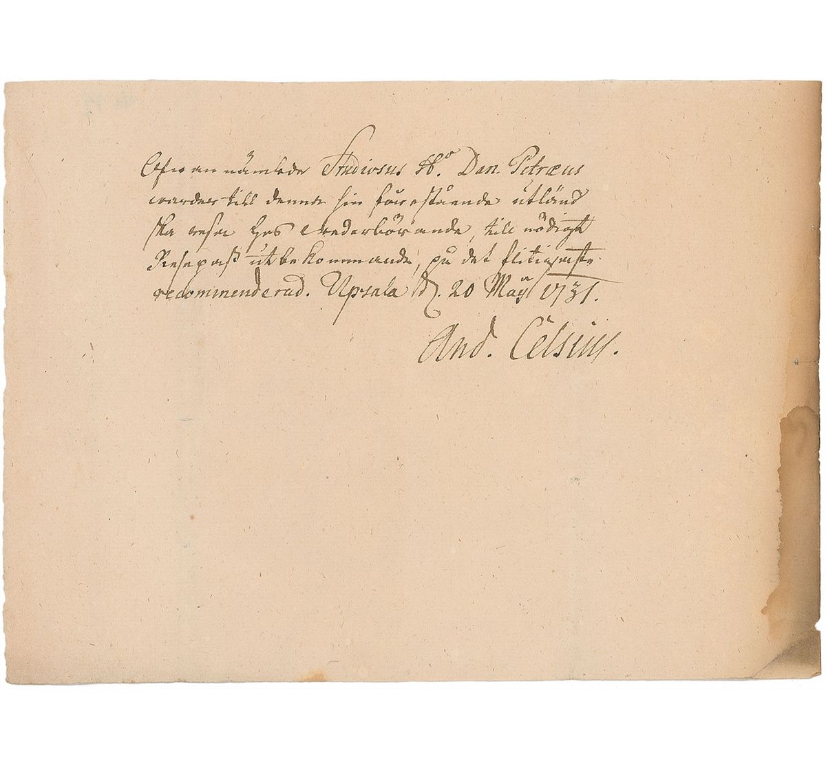 Swedish astronomer, physicist, and mathematician (1701–1744). Rare ALS in Swedish, signed “And. Celsius,” one page, 8 x 5.75, May 20, 1731. An untranslated letter of recommendation for student Dan Petraeus. In fine condition, with mild overall wrinkling and a stain to the right edge. This letter was written by Celsius early in his career, during his second year as professor of astronomy at Uppsala University. In 1730 he had published A New Method for Determining the Distance from the Earth to the Sun, and throughout the early 1730s he traveled through Germany, Italy, and France, visiting most of the major European observatories. He went on to play a major role in raising public and private funding to build a modern observatory in Sweden, and was able to found the Uppsala Astronomical Observatory in 1741.