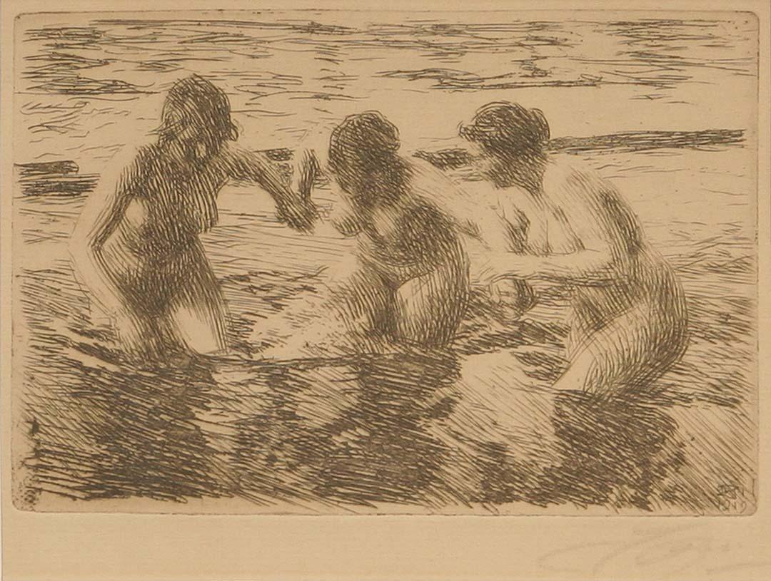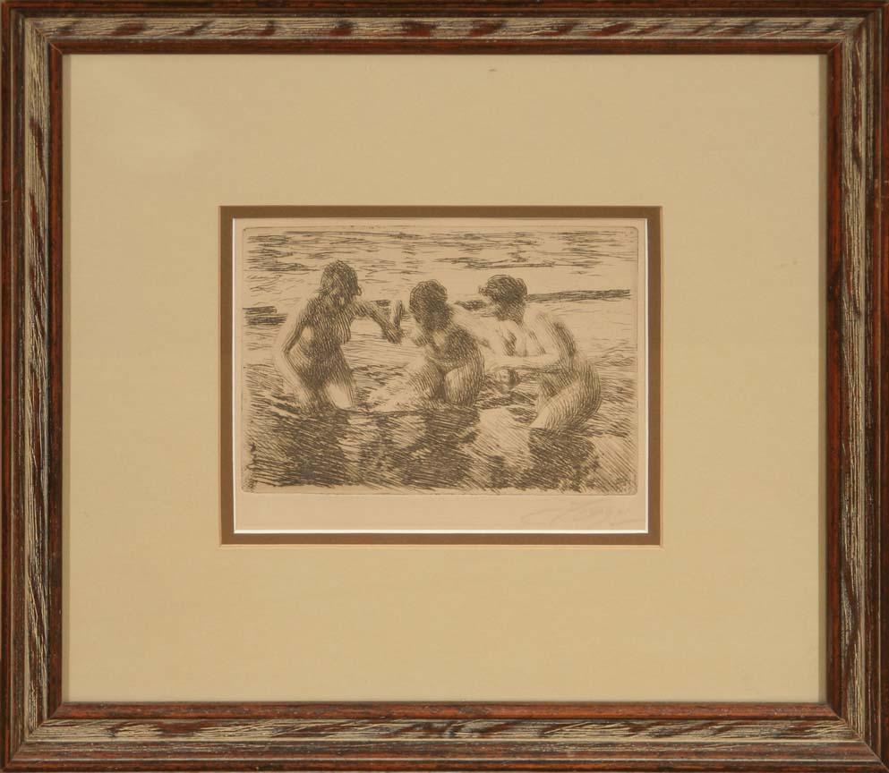 Anders Zorn (1860-1920). Against The Current, 1919. 4 ½" x 6 ?" etching. Pencil signed lower center margin. (est $600-900). Provenance: Bethany College, Lindsborg, KS. . For condition reports please visit: www.auctioninsantafe.com/cr2011.pdf