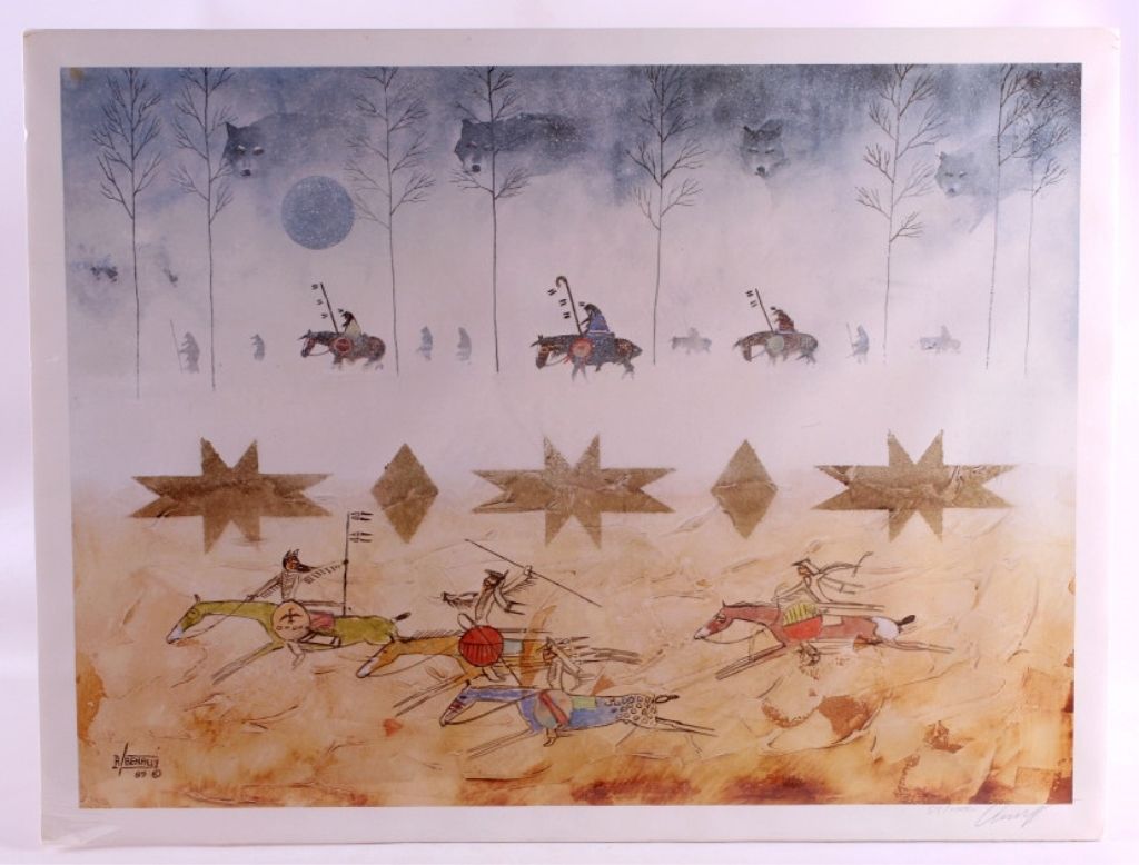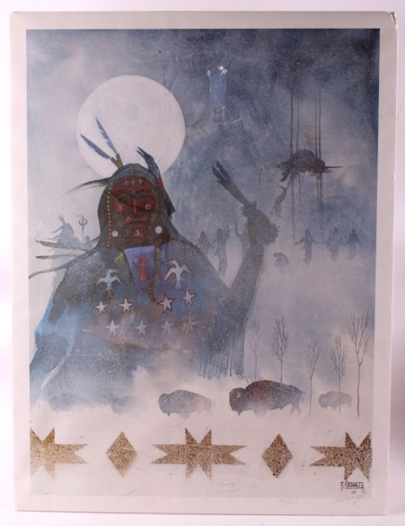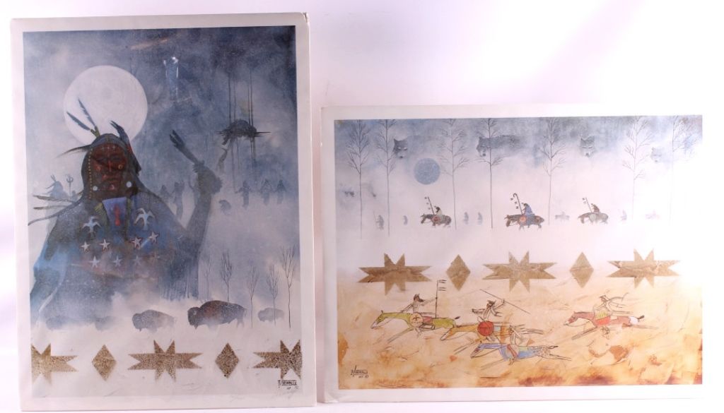 This is a pair of Anderson Benally prints. These are limited editions of 1000. They have been hand signed and numbered by the artist. One is numbered "161/1000" and the other is "59/1000". Each print demonstrates Benally's Native American heritage and artistic style. Each print is in very good condition and has been shrink wrapped. The prints measure 22" x 29".