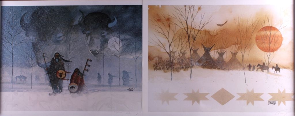 This is a pair of Anderson Benally prints. These are limited editions of 1000. They have been hand signed and numbered by the artist. One is numbered "812/1000" and the other is "553/1000". Each print demonstrates Benally's Native American heritage and artistic style. Each print is in very good condition. The prints measure 22" x 29".