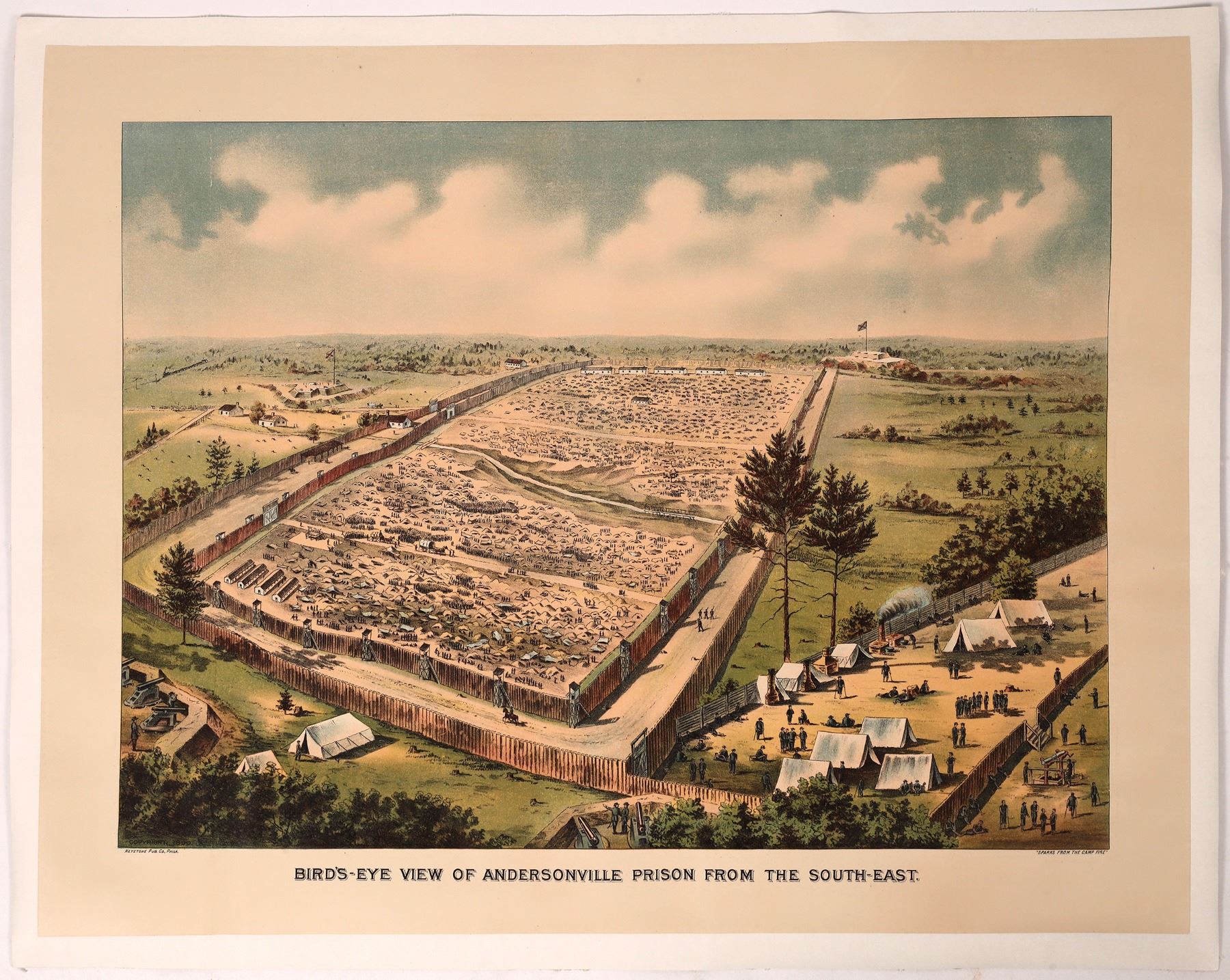 Birdseye view of infamous Andersonville Prison From the Southeast print mounted on linen backing. Bold colors, slight vertical crease on left side. 17x22". "Commanded by Captain Henry Wirz, who was tried and executed after the war for war crimes. The prison was overcrowded to four times its capacity, and had an inadequate water supply, inadequate food, and unsanitary conditions. Of the approximately 45,000 Union prisoners held at Camp Sumter during the war, nearly 13,000 died. The chief causes of death were scurvy, diarrhea and dysentery." from Wikipedia.