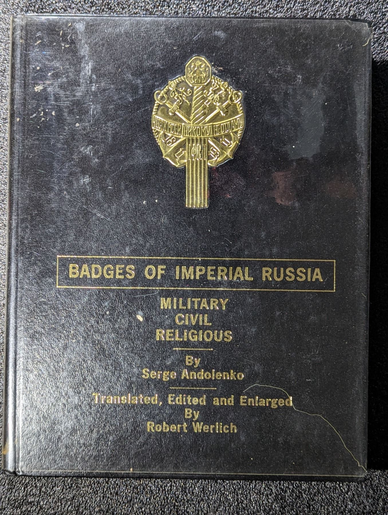 Andolenko, Serge. BADGES OF IMPERIAL RUSSIA. MILITARY, CIVIL, RELIGIOUS. Quaker Press, Washington, D.C. 1972. 4to. (2), 212, (2) pages. black leatherette, embossed, gilt, protector. 8 pages of color photos. b&w photos throughout. Fine. Lot weight: 2 lbs 11oz. Subject(s): Russian Medals.