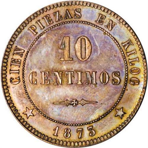 <B>Republic 10 Centimos 1873, </B></I> KM-X2, revolution of 1873, nice AU-UNC, cleaned long ago and now toned, very scarce.<BR><BR><b>Shipping:</b> Coins & Currency (<a target="_blank" href="http://www.heritageauctions.com/common/shipping.php">view shipping information</a>)