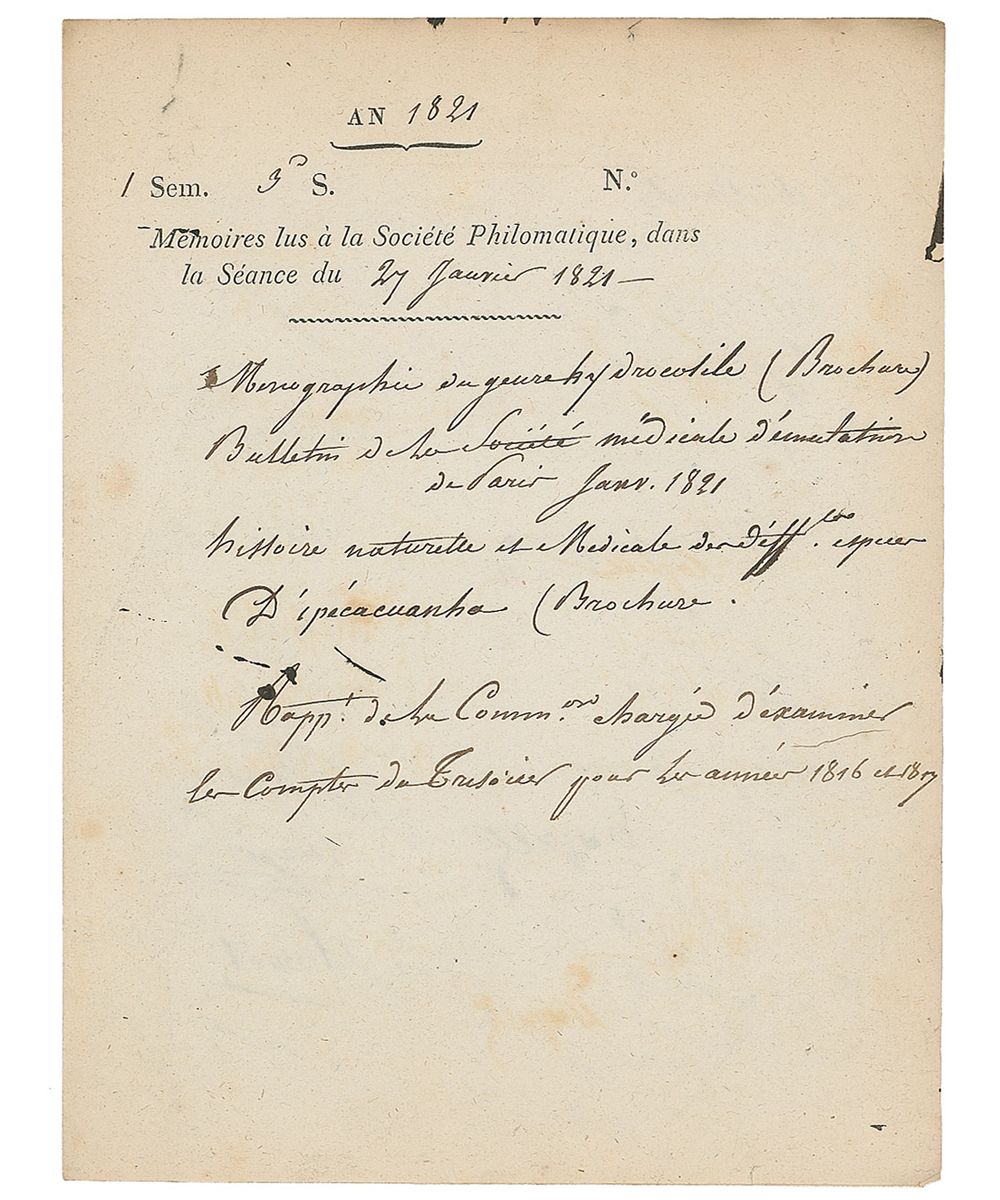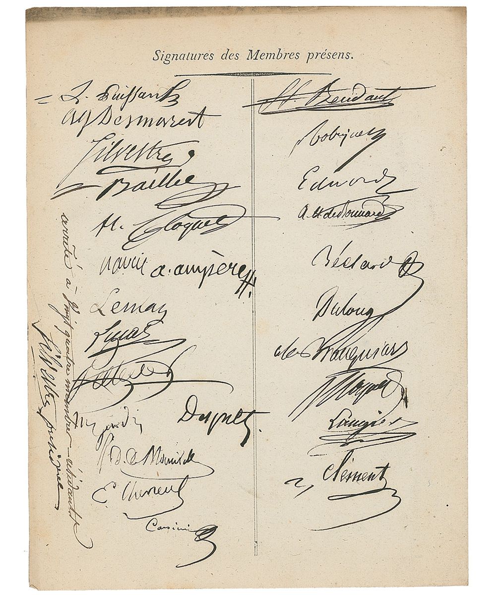 Influential French physicist (1775–1836) who pioneered the discovery and understanding of electromagnetism; a unit of electric current was named in his honor. Rare partly-printed DS in French, signed “A. Ampere,” two pages on two adjoining sheets, 7 x 9.25, July 1821. Document signed on the second page by Ampere and 25 other members of the “Societe Philomatique,” a prominent scientific society in early 19th-century France. List of the scientific works recently received by the society. Also signed by famous chemist Michel Eugene Chevreul and the botanist Henri Cassini. In fine condition, with a bit of scattered light toning.