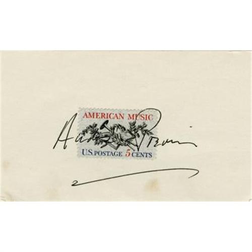 <B>André Previn Autograph.</B></I> A 5" x 3" card, with a five-cent stamp affixed, signed by the Academy Award-winning pianist/conductor/composer in black ink. Previn's autograph extends across the face of the stamp and is large and clean. In Very Fine condition with a minor area of toning under the autograph (not affecting signature).<BR><BR><b>Shipping:</b> Flat Material, Small (<a target="_blank" href="http://www.heritageauctions.com/common/shipping.php">view shipping information</a>)