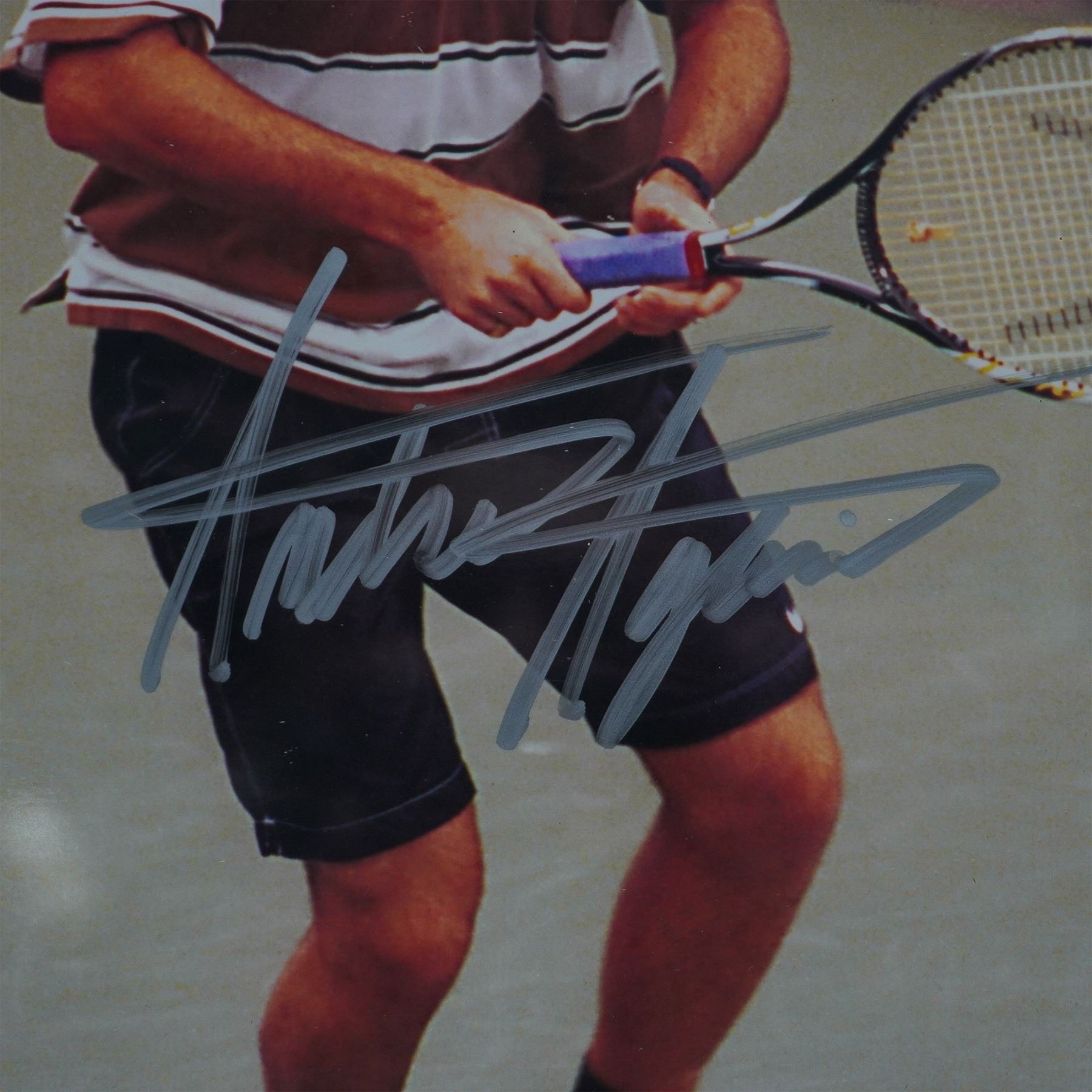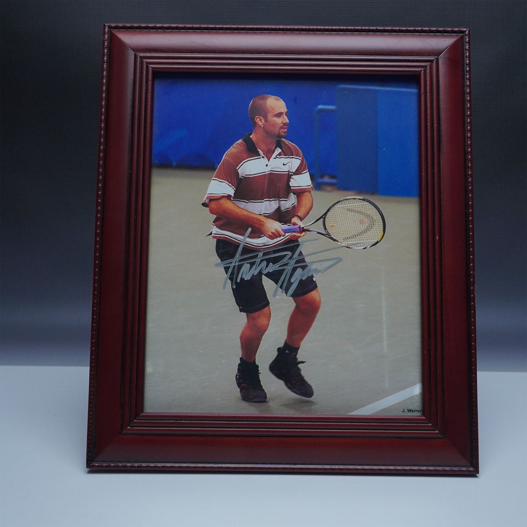 A framed 8x10 photograph signed by tennis legend Andre Agassi, captured in action on the court. The signature is boldly placed in silver marker across the lower portion of the image. The photograph is professionally housed in a wood-toned frame with a clear display cover, ready for display. Accompanied by a Certificate of Authenticity from Net Serve Sports, attesting to the autograph's authenticity. A fantastic collectible for tennis enthusiasts and sports memorabilia collectors.