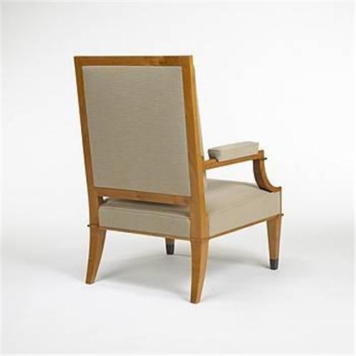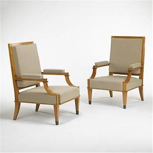Andre Arbus<BR>armchairs, pair<BR>France, c. 1940<BR>sycamore, brass, upholstery<BR>26"w x 30"d x 40"h<BR>Sold with letter of authenticity from Yves Gastou.<BR>Literature: Andre Arbus: Architecte-Decorateur Des Annees 40, Brunhammer, ppg. 114-115 illustrates a similar example<BR>Provenance: Private collection, New York<BR><BR><BR><BR>