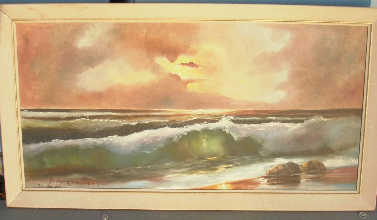 André BERTOUNESQUE (1937-deces 2005) naissance en France et deces Laval, au Quebec, Canada; ses peintures sont dans plusieurs collections privees; des galleries d'art les vendaient; cellec-ci 'Soleil' est tres belle, signee et date 1965, huile sur toile 20 haut par x 40 pouces longue, cadre des annees 60: 23 1/2 h x 43 1/2; on peut la poster sans cadre si tu desires ainsi ou si tu ne veus pas l'avoir; avec certificat de PROVENANCE et PLUSIEURS copies de votre recu pour ton usage; c'est une belle decouverte et une image maitrisee !