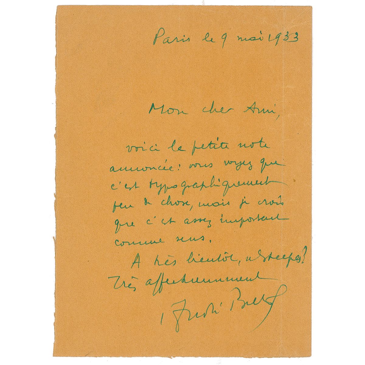 French writer and poet (1896–1966) best known as the founder of Surrealism. ALS in French, one page, 4 x 5.5, May 9, 1933. Letter to his dear friend, Rene Laporte. In full (translated): “Enclosed is the small text that I told you about. It is not particularly impressive from a typographical point of view but I do think it is very meaningful.” In fine condition, with scattered light creasing and wrinkling. Accompanied by the original mailing envelope.