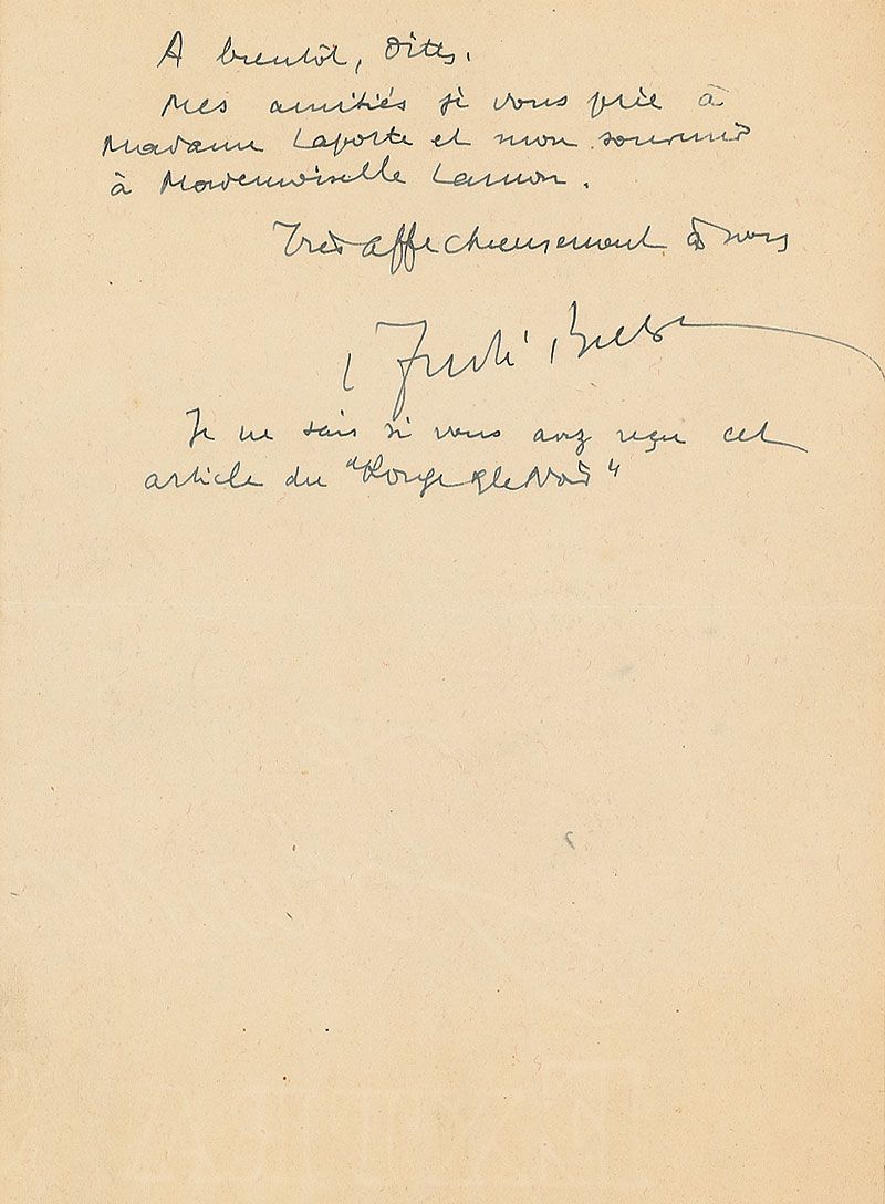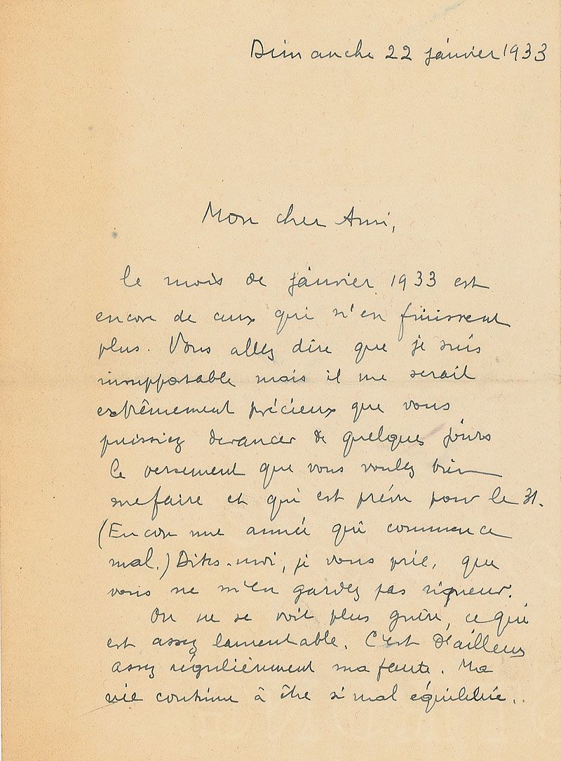 French writer and poet (1896–1966) best known as the founder of Surrealism. ALS in French, two pages on two adjoining sheets, 5.25 x 7, January 22, 1933. Letter to René Laporte, who supported Breton financially. The poet asks him to advance his January payment as the start of the year is always “difficult,” and asks if Laporte has received his article on "Le Rouge et le Noir." Breton also declares that his life “continues to be so unbalanced." In fine condition.