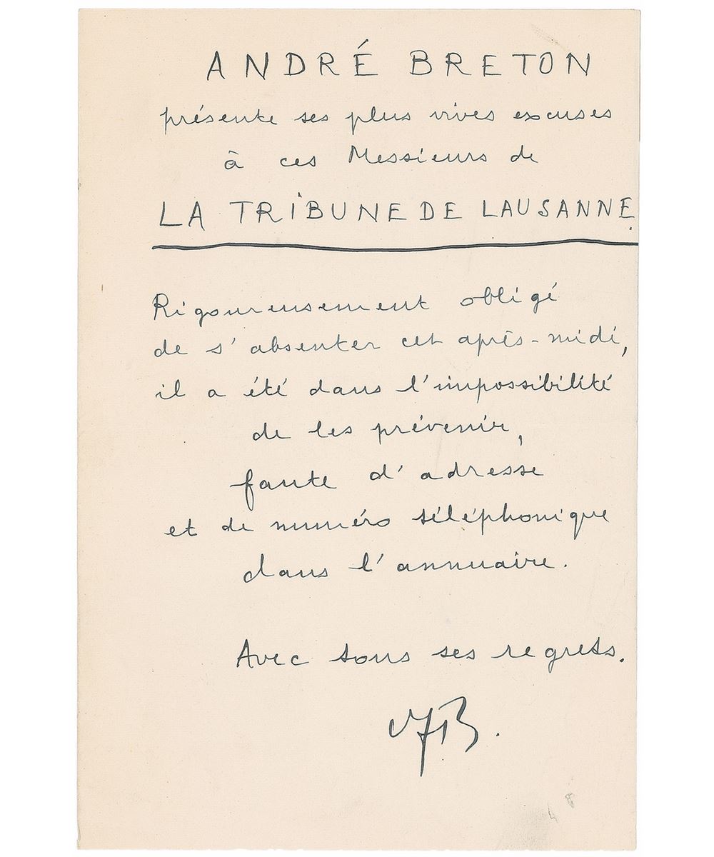 ALS in French, signed “AB,” one page, 5.25 x 8, no date. Third-person letter apologizing for his absence. In full (translated): “Andre Breton presents his deepest apologies to the gentlemen of the Gallery Lausanne. Strictly necessary to be absent this afternoon, he was unable to prevent the lack of address and telephone number in the directory.” In fine condition, with light creases and a tack hole to the lower right corner.