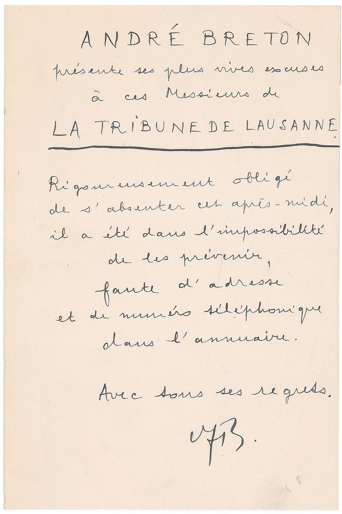 French writer and poet (1896–1966) best known as the founder of Surrealism. ALS in French, signed "AB," one page, 5.25 x 8, no date. Third-person letter apologizing for his absence. In full (translated): "Andre Breton presents his deepest apologies to the gentlemen of the Gallery Lausanne. Strictly necessary to be absent this afternoon, he was unable to prevent the lack of address and telephone number in the directory." In fine condition, with light creases and a tack hole to the lower right corner.