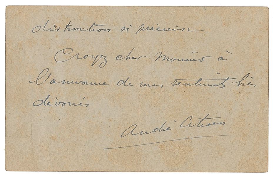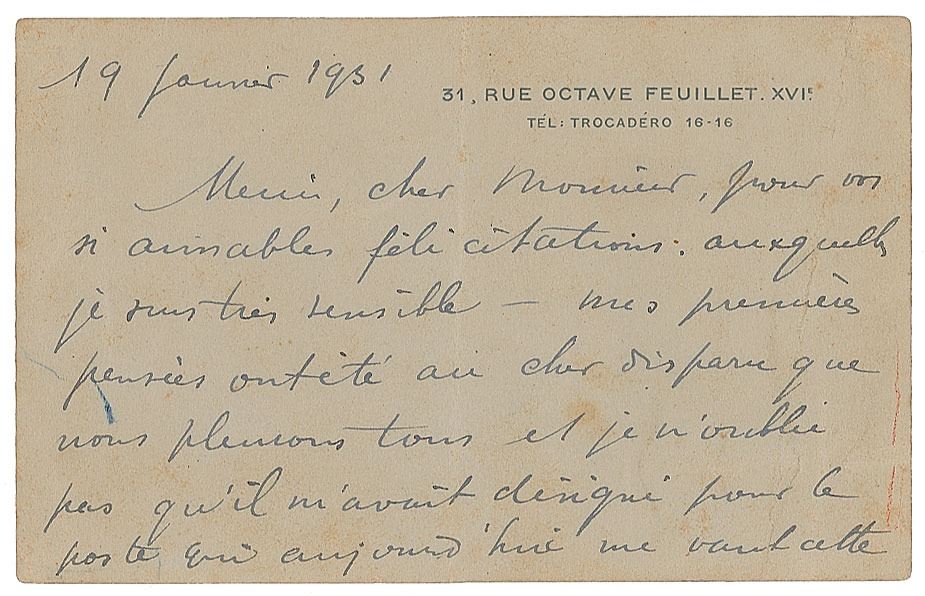 Untranslated ALS in French, one page both sides, 6 x 3.75, Rue Octave Feuillet stationery card, January 19, 1931. In very good to fine condition, with light overall staining, and a central vertical fold.
