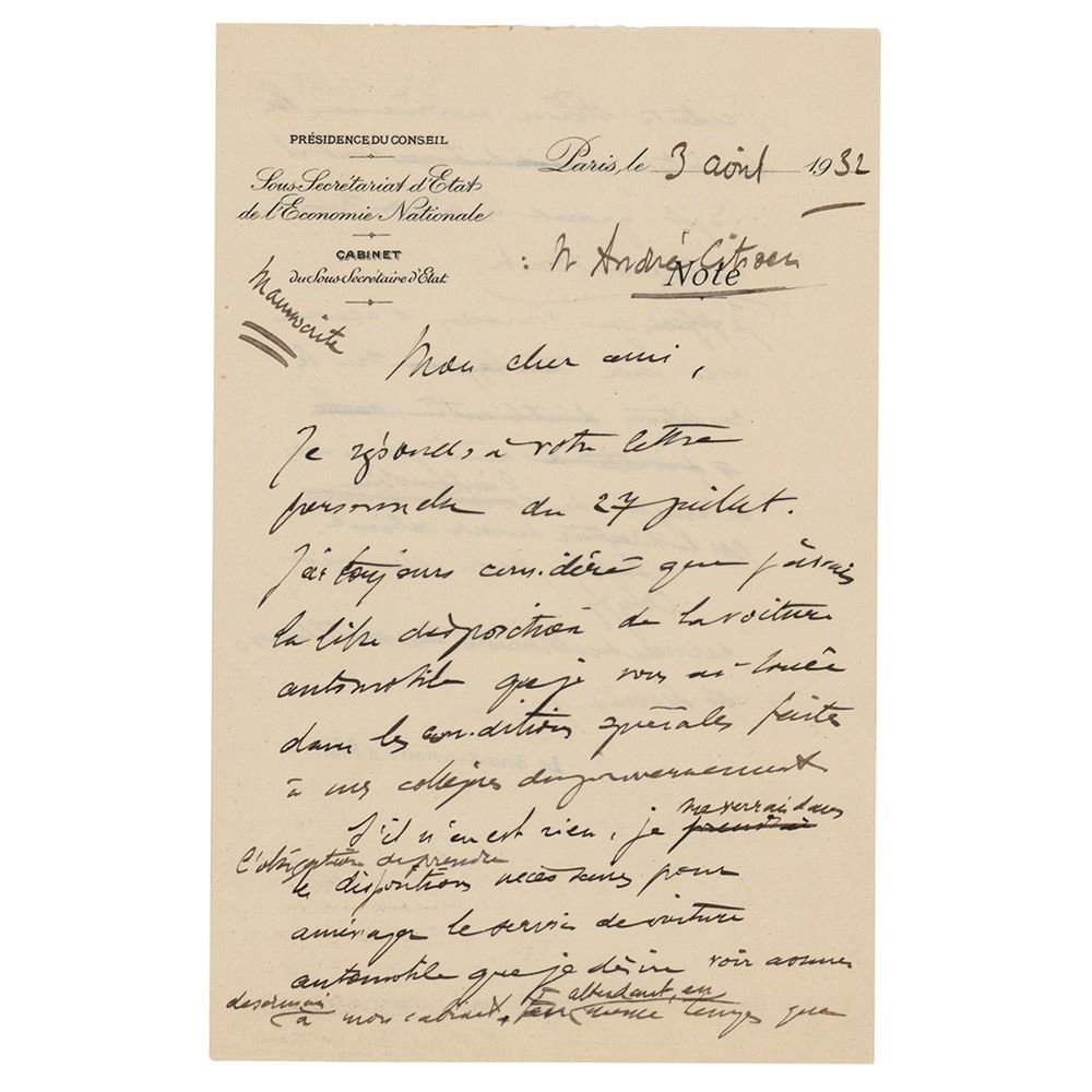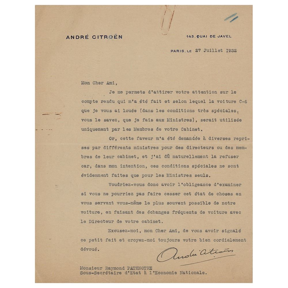 French industrialist (1878–1935) best remembered for the make of car bearing his name. TLS in French, one page, 8 x 10, personal letterhead, July 27, 1932. Letter to Raymond Patenotre, in part: "I take the liberty of drawing your attention to the report which was given to me and according to which the C-6 car that I rented you (under the very special conditions, you know, that I give to the Ministers), would be used only by Members of your Cabinet. This favor was requested of me on various occasions by different ministers for directors or members of their cabinet, and I naturally had to refuse it because, in my intention, these special conditions are obviously only made for ministers alone. Would you therefore be so kind as to examine whether you could not put an end to this state of affairs by using our car yourself as often as possible, by making frequent car exchanges with the director of your cabinet." In fine condition, with a crease to the lower left corner, and several rusty paperclip impressions. Accompanied by a draft of Patenotre's response.