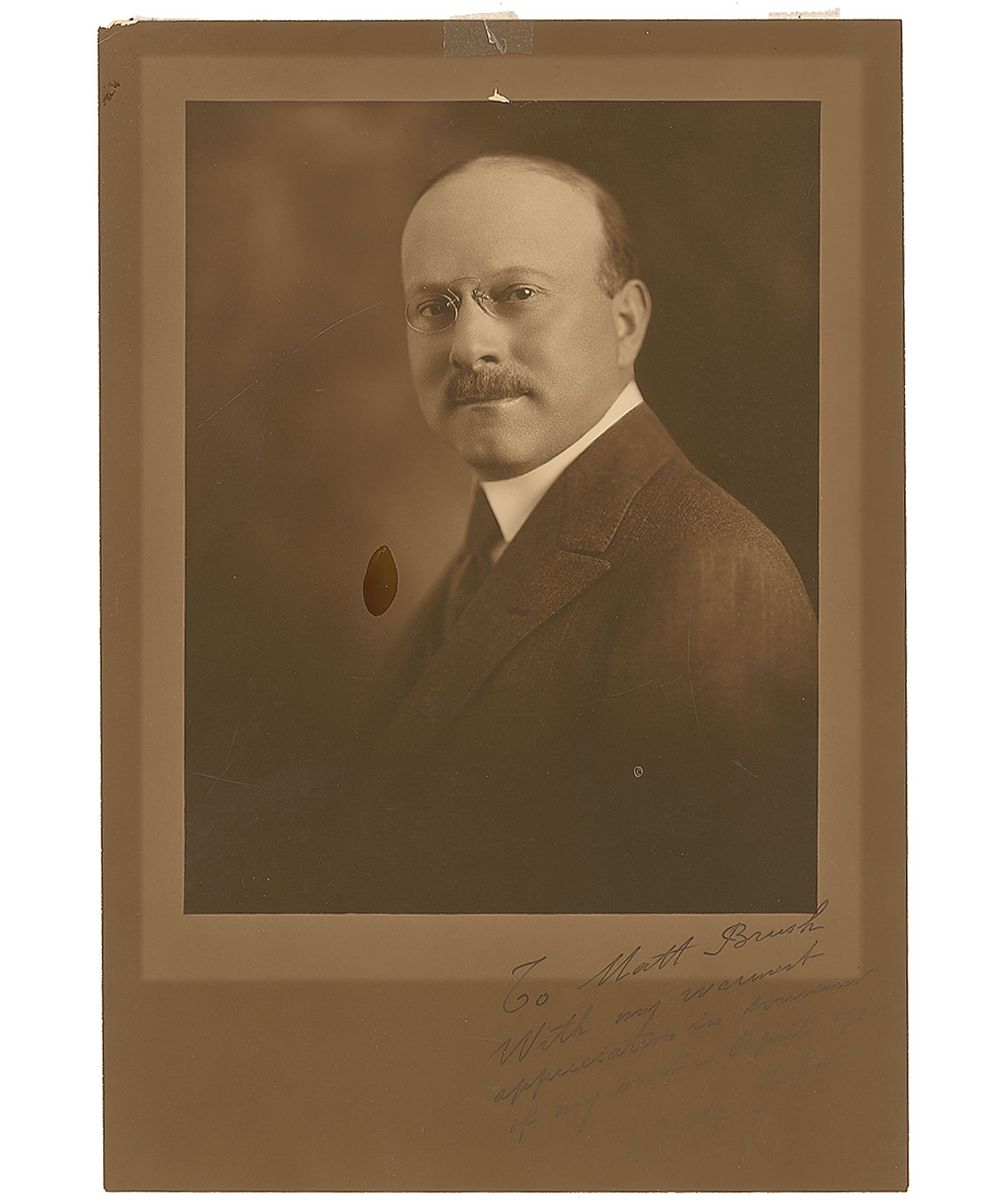 French industrialist (1878–1935) best remembered for the make of car bearing his name. Vintage matte-finish 9 x 13 portrait of Citroen by Champlain Studios of New York, signed and inscribed in black ink, “To Matt Brush, With my warmest appreciation in souvenir of my visit—April 1923, Andre Citroen.” Blindstamped in the lower right by the photography studio. In very good condition, with a repaired tear to the upper border (repaired with tape to the front and touching the very top of the image), a spot of glossy residue to the left of his chest, and moderate contrast to the signature against the dark background; the image is exceptionally crisp and clear.