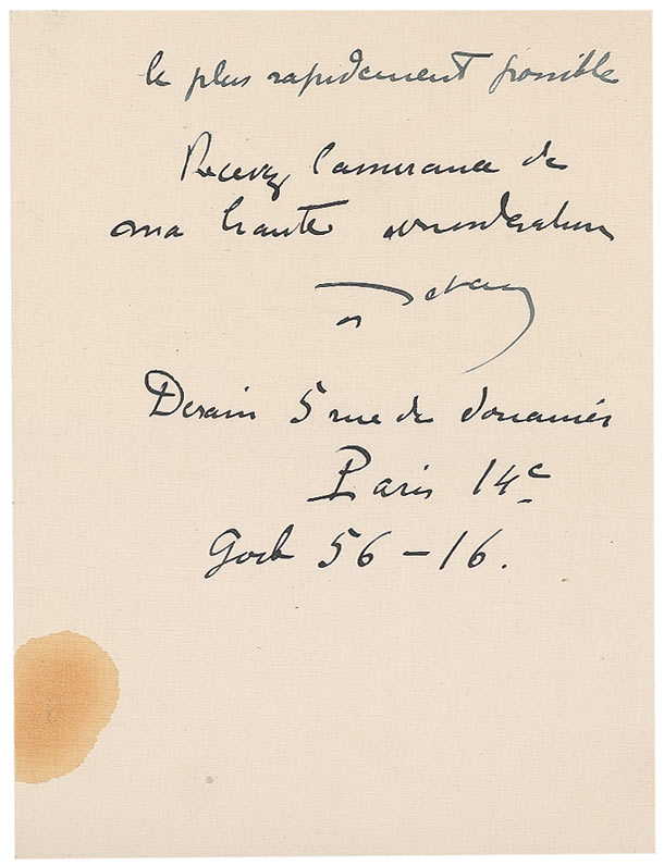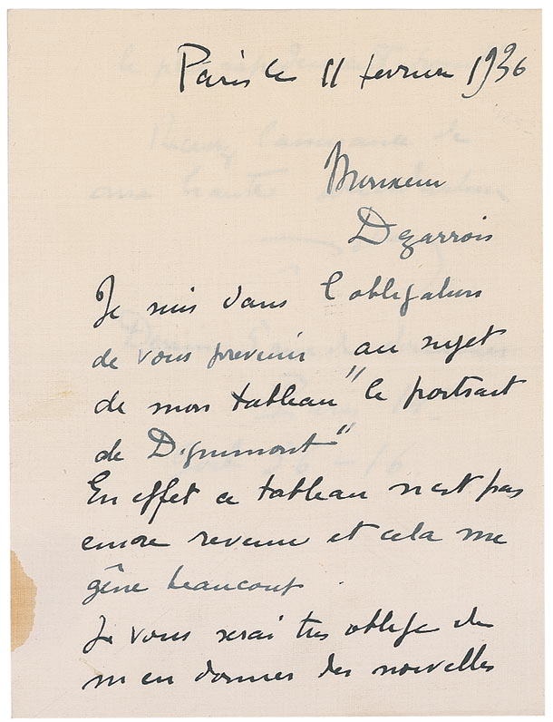 French artist and sculptor (1880–1954) and co-founder of Fauvism with Henri Matisse. ALS in French, two pages on two adjoining sheets, 5 x 6.5, February 11, 1936. Letter to Andre Dezarrois, curator of the Jeu de Paume Museum in Paris. In part (translated): “I am compelled to write you about my painting ‘le portrait de Diguemont.’ It hasn’t come back yet and I am very troubled about that. I’d be grateful for information as soon as possible.” Small stain to lower left along hinge and bottom of second page, otherwise fine condition.