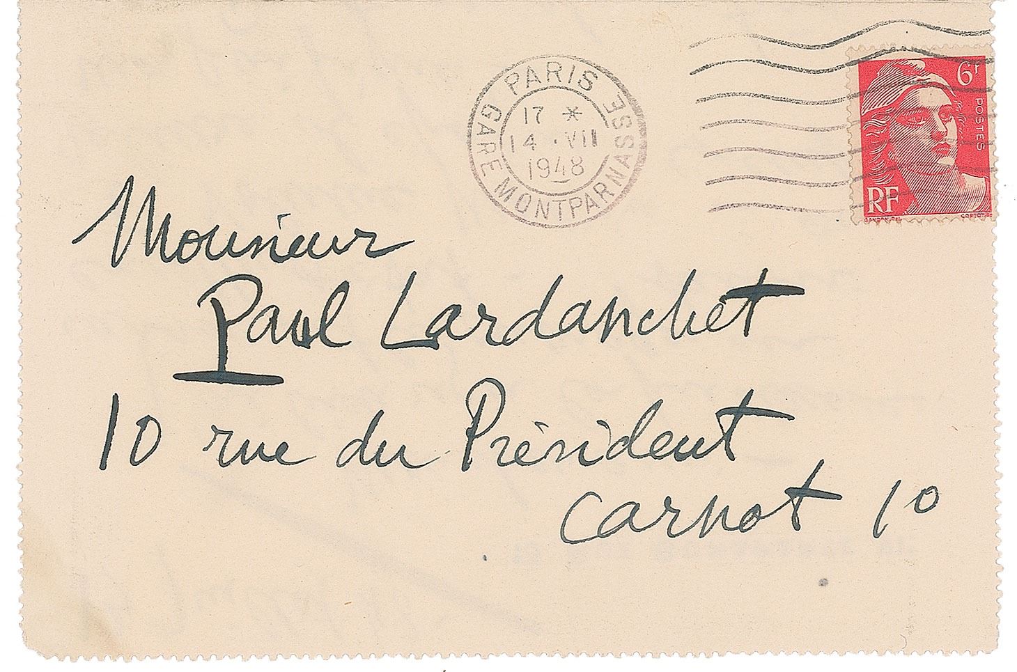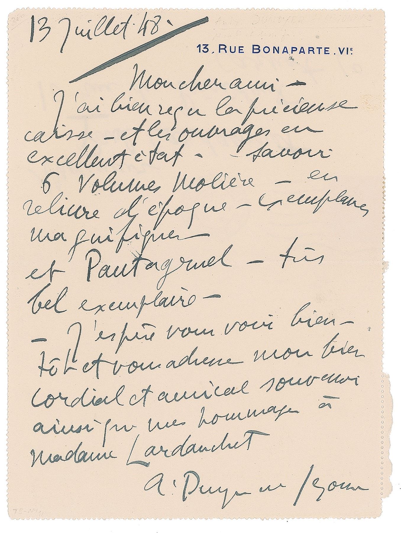 French modernist painter and printmaker (1884–1974) whose work was included in the influential 1913 Armory Show in New York. Untranslated ALS in French, one page, 4.25 x 7, personal letterhead, July 13, 1948. Addressed on the reverse in his own hand. In fine condition.