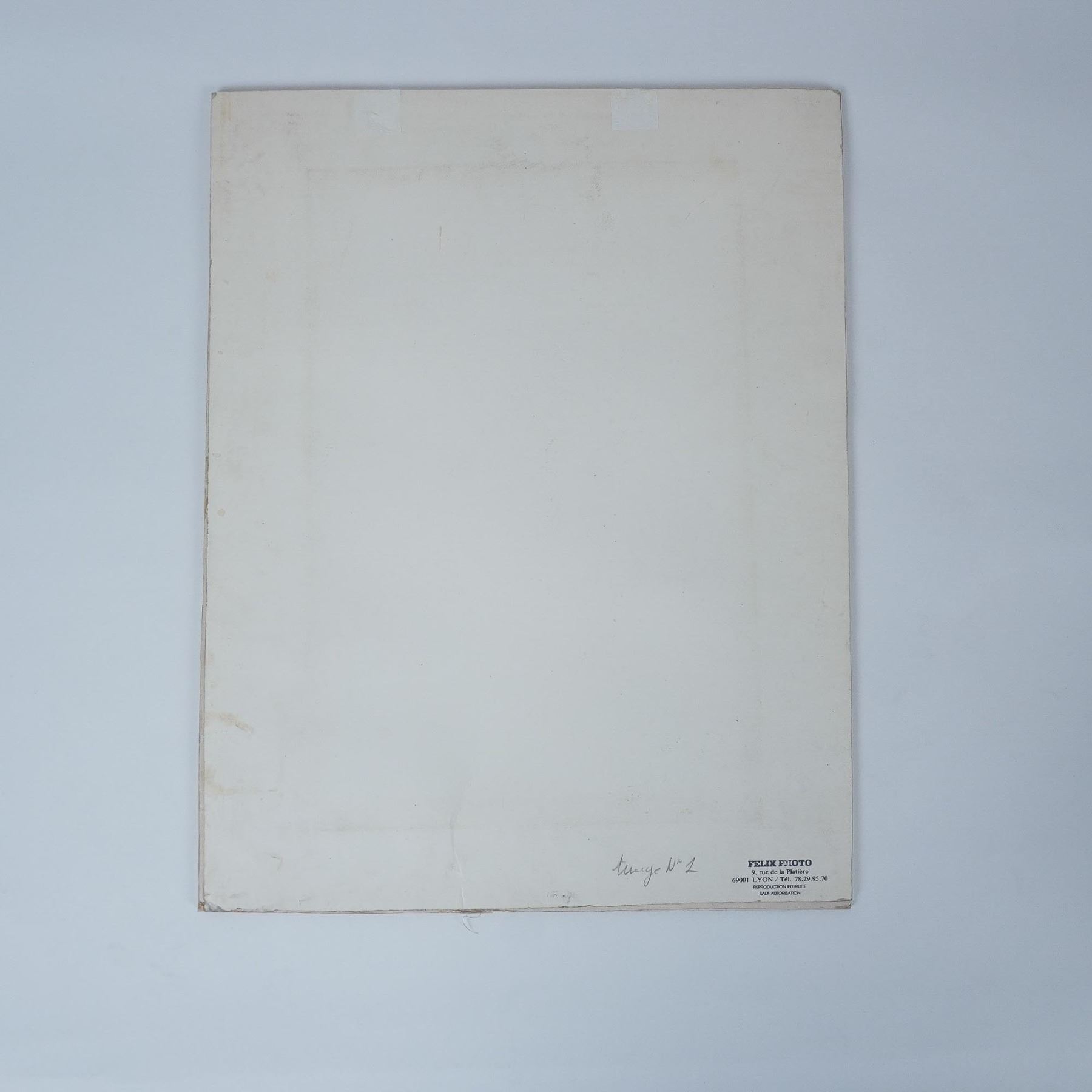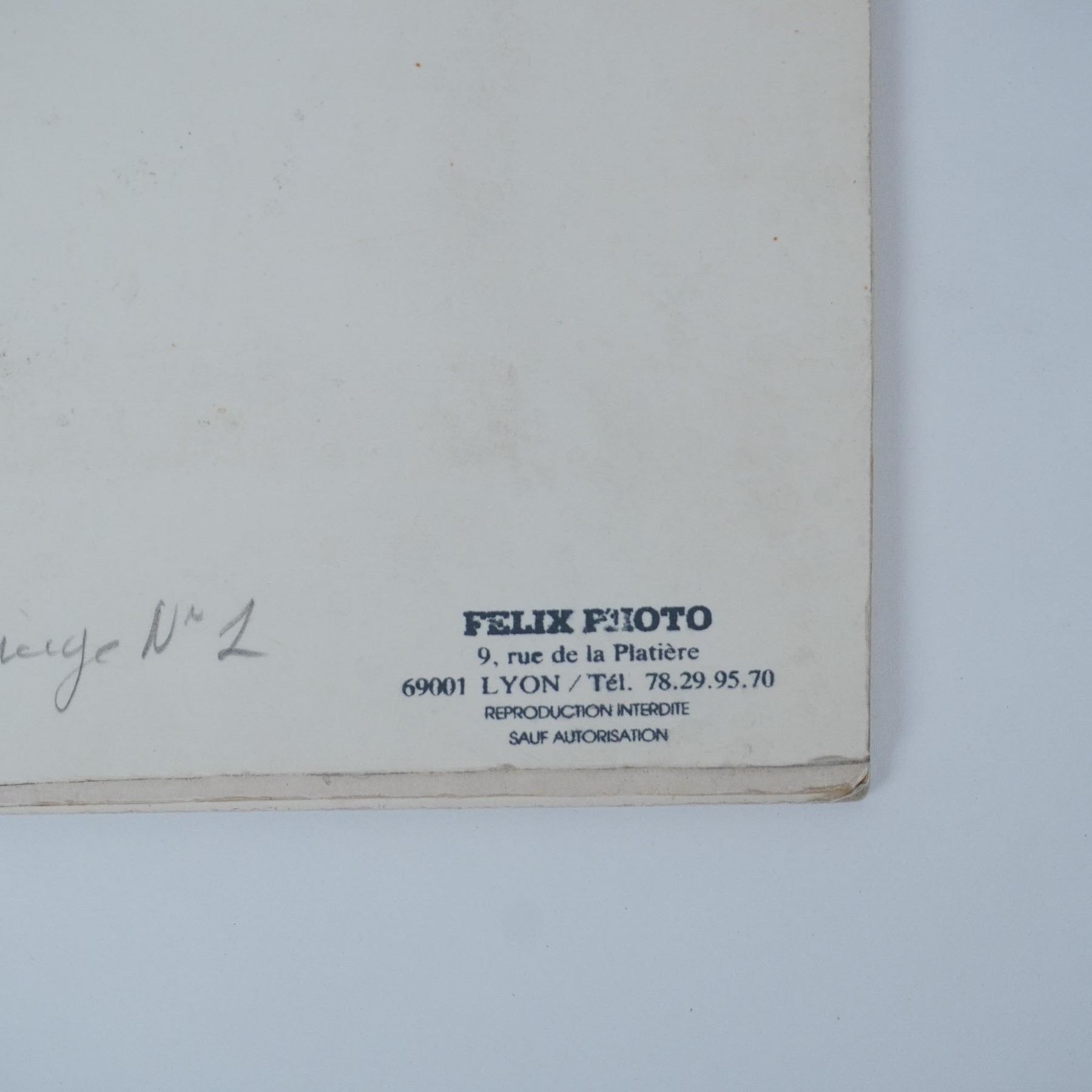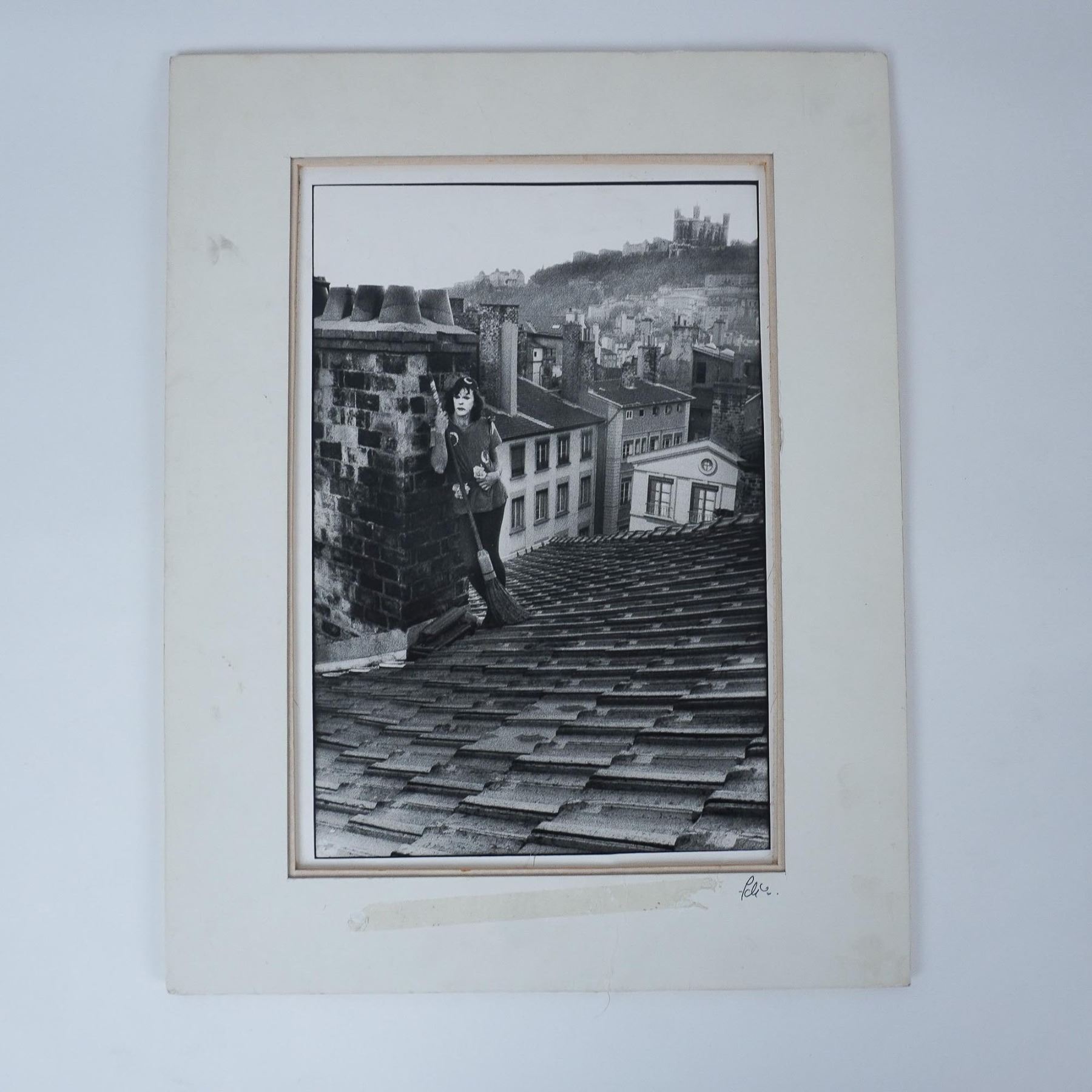 This is a striking silverprint photograph by French "Baroque" photographer Andre Felix. Titled Toit a Lyon (Roof in Lyon), this composition captures a unique perspective of a woman as a clown-chimney sweeper perched on a rooftop in the historic city of Lyon, France. In the background, the architectural landmarks of Lyon, including the iconic Basilica of Notre-Dame de Fourviere, are visible, creating a timeless juxtaposition of urban life and historical grandeur. The silverprint process enhances the photograph's tonal range and depth, providing exceptional clarity and contrast, characteristic of fine art photography from the mid-20th century. The photograph bears Felix's signature on the matting, demonstrating authenticity. The back of the mat is stamped with the photographer's studio address, FELIX PHOTO, 9, rue de la Platiere, Lyon, France, along with a handwritten Tirage #1, indicating its rarity. Andre Felix is celebrated for his evocative black-and-white photography, focusing on urban landscapes and everyday life in France. His work often explores themes of human interaction within historic and cultural settings, emphasizing mood and composition. Photograph dimensions with frame: 13.75"L x 17.75"H.