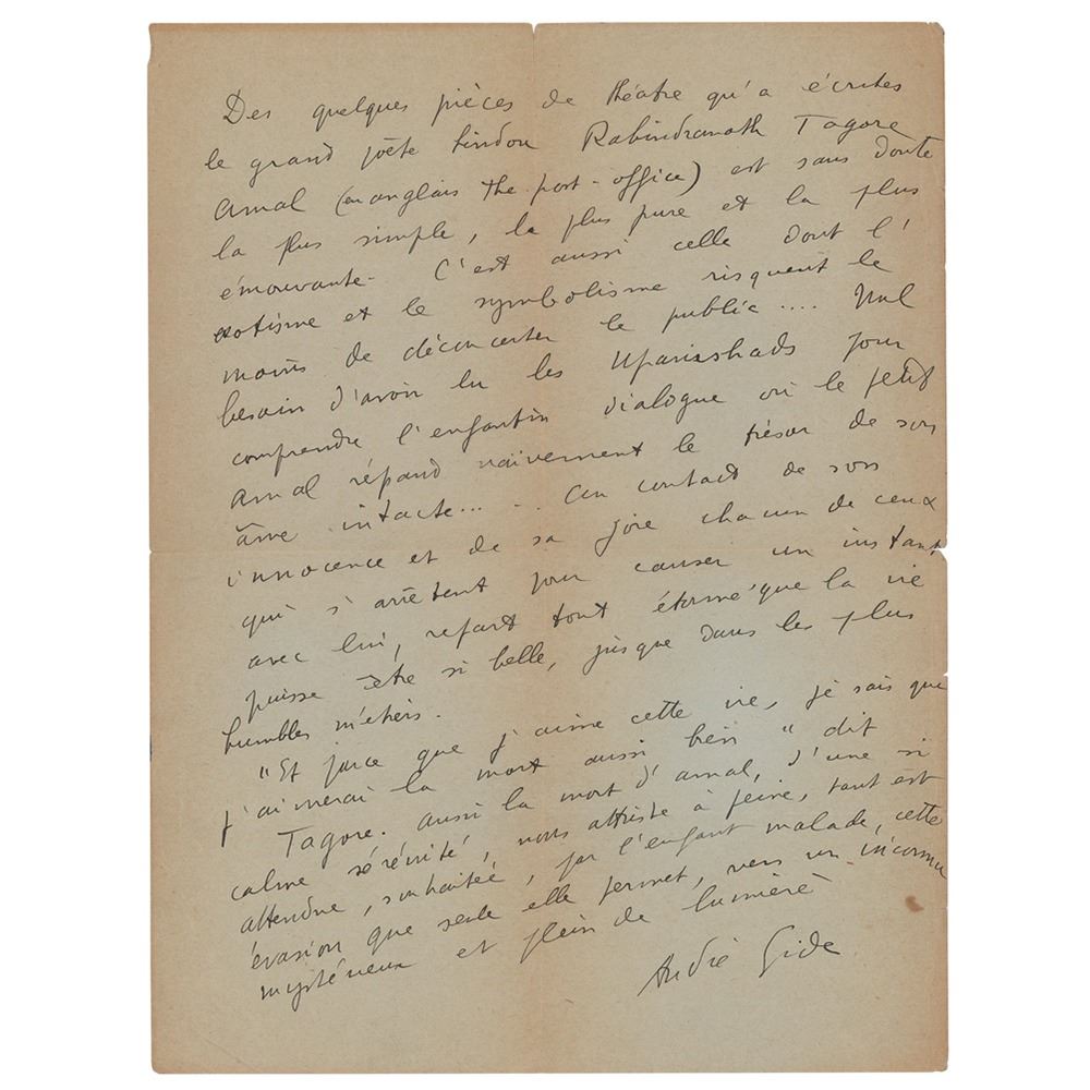 AMS in French, one page, 8 x 10.5, no date. Gide gives a discourse on the 1912 play 'The Post Office' by Nobel Prize–winning Bengali poet Rabindranath Tagore. In part (translated): "Among the few plays written by the great Indian poet Rabindranath Tagore, 'The Post Office' is undoubtedly the simplest, the purest and the most moving one. It is also the one which exoticism and symbolism are the least likely to disconcert the audience…It is not necessary to have read the Upanishads to understand the childlike dialogue in which little Amal spreads out naively the treasure of his intact soul…His innocence and his joy cause all those who stop by to chat with him to go their way astonished that life could be so beautiful, even in the humblest professions. 'Because I love life, I know that I will cherish death as well,' says Tagore. Thus, Amal's calm and serene death hardly makes us feel sad, because the sick child has expected it and desired it so much, since only death could allow him to escape to a mysterious and luminous universe." In very good condition, with irregular toning, and splitting to the ends of the intersecting folds.
