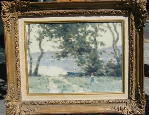 <B>Artist: </b>Andre Gisson (French, 1921-2003)<BR><b>Title:</b>Boaters on a river bank<BR><B>Medium:</B>Oil on canvas<BR><B>Size:</B>12" x 16"<BR><B>Signed:</b>Lower right