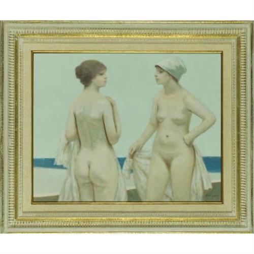 <B>ANDRE GISSON (American, 1928-2003)</B></I><BR><I>The Nude Bathers</B></I><BR>Oil on canvas<BR>16 x 20 inches (40.6 x 50.8 cm)<BR>Signed lower right: <I>Gisson</B></I><BR> <BR>PROVENANCE:<BR>Miner's Gallery Americana, Carmel, California (label verso);<BR>Alan Barnes Fine Art, Dallas, Texas (label verso)<BR><B>Condition Report:</B> Excellent condition.<BR><BR><b>Shipping:</b> Requires 3rd Party Shipping (<a target="_blank" href="http://www.heritageauctions.com/common/shipping.php">view shipping information</a>)